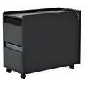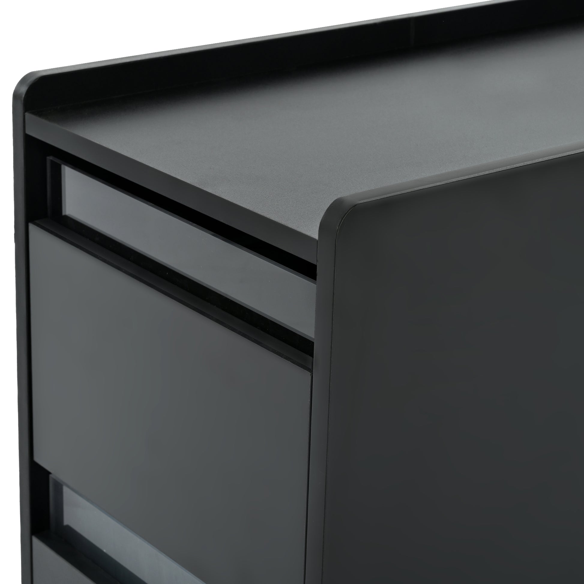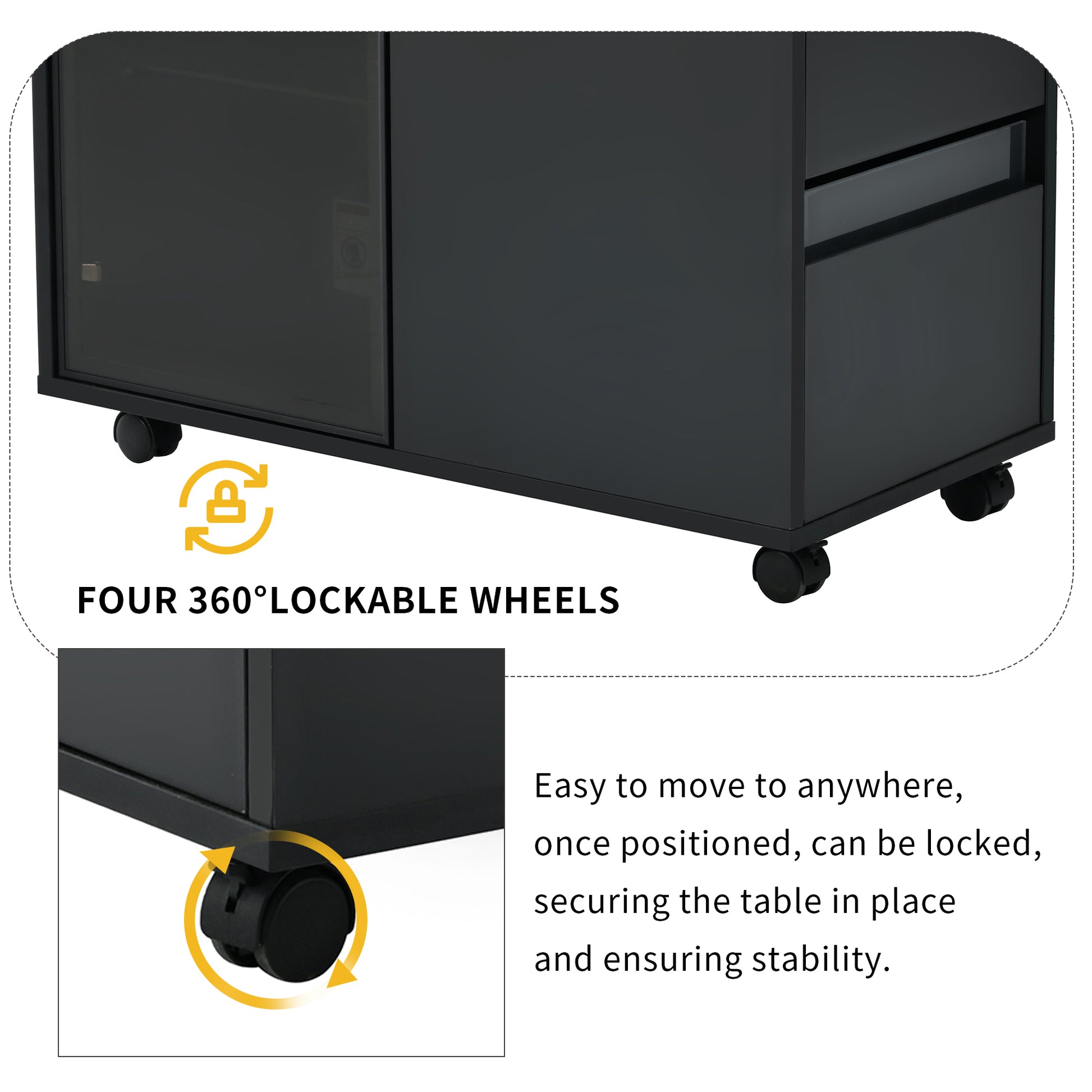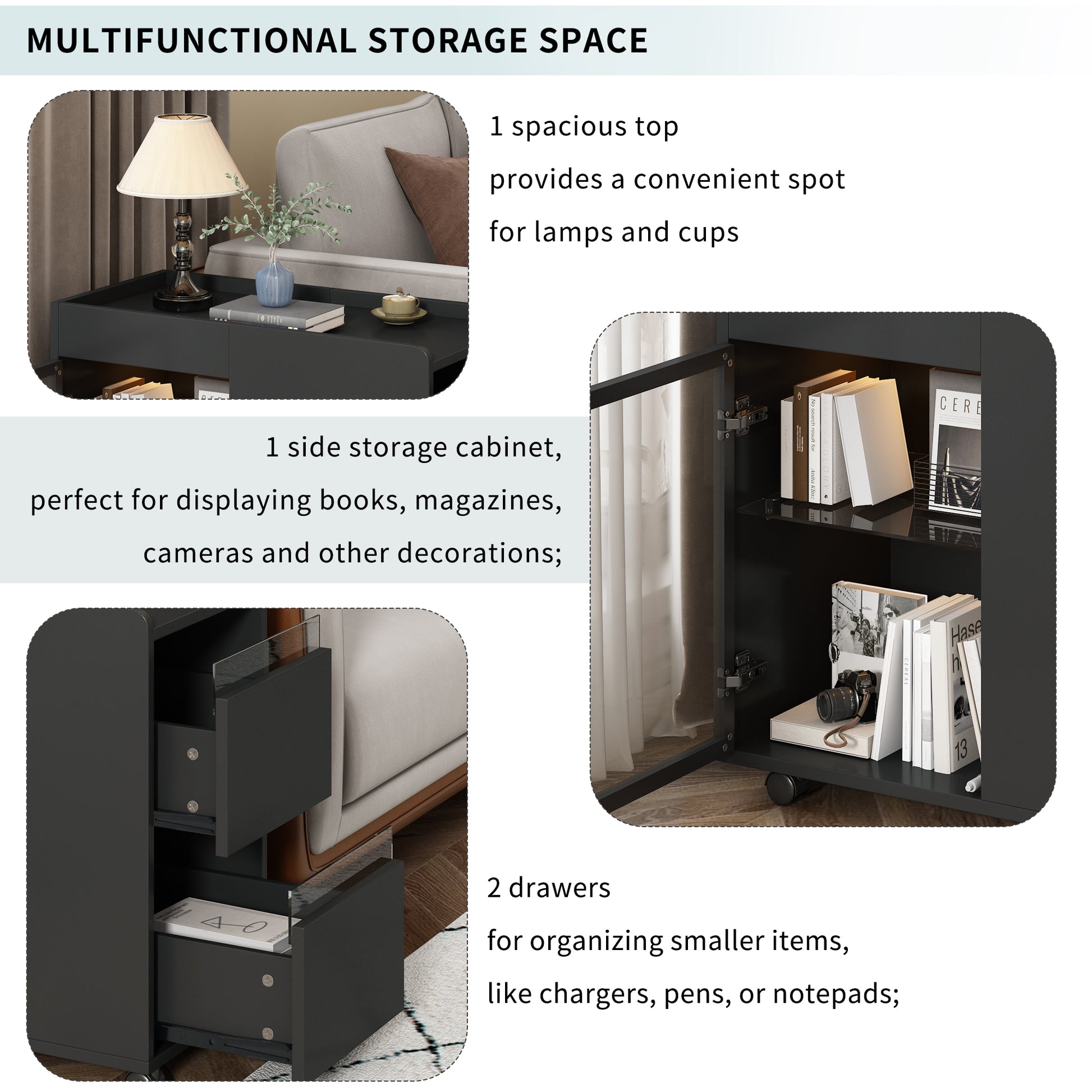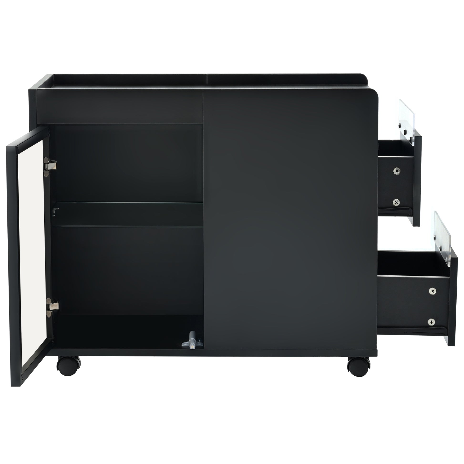 Modern End Table With Led Light And Wheels, Side Table With Transparent Brown Glass Door, 2 Storage Shelves And Drawers For Living Room, Black Black Mdf