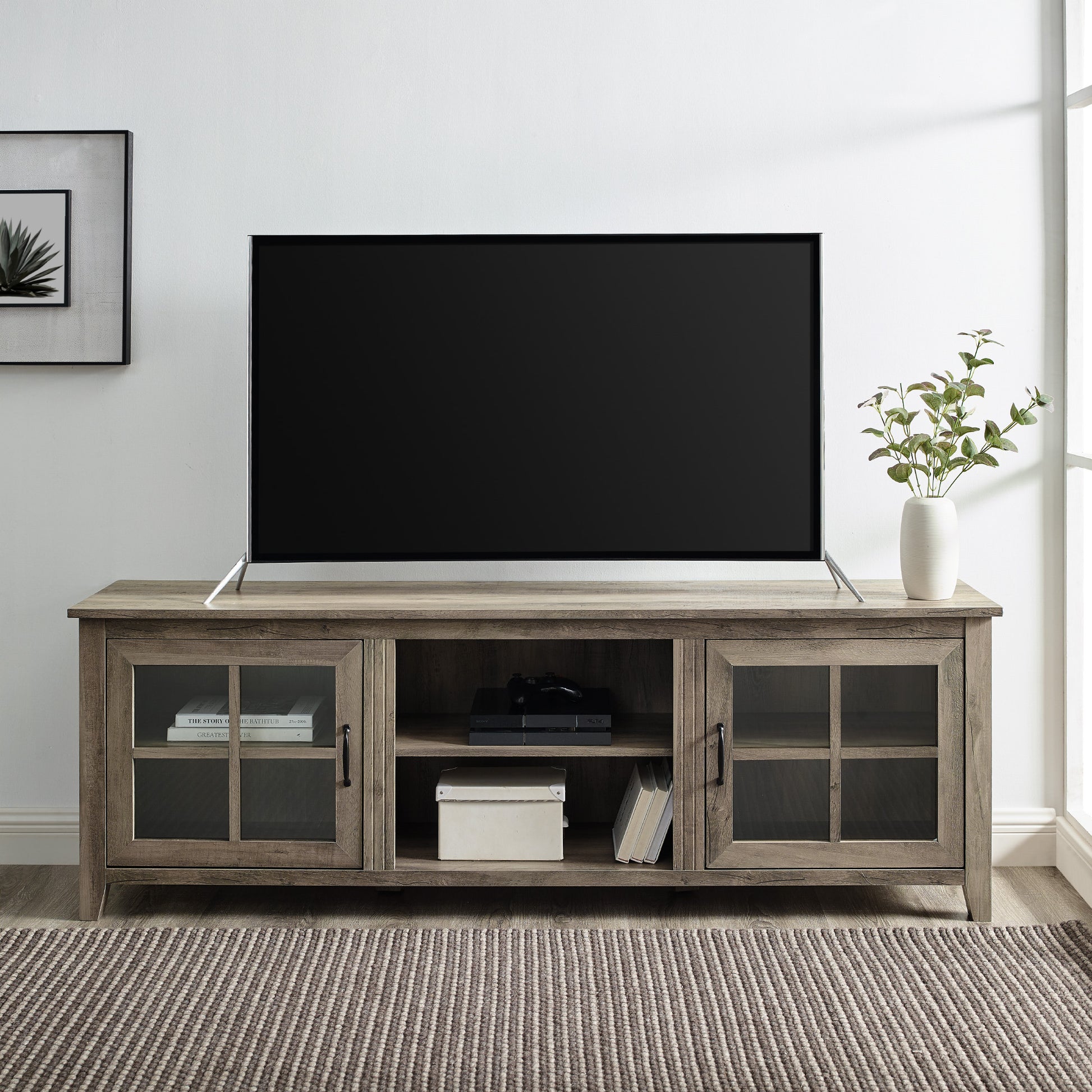Modern Farmhouse 2 Door Glass Windowpane 70" Tv Stand For 80" Tvs Grey Wash Gray Wash Mdf