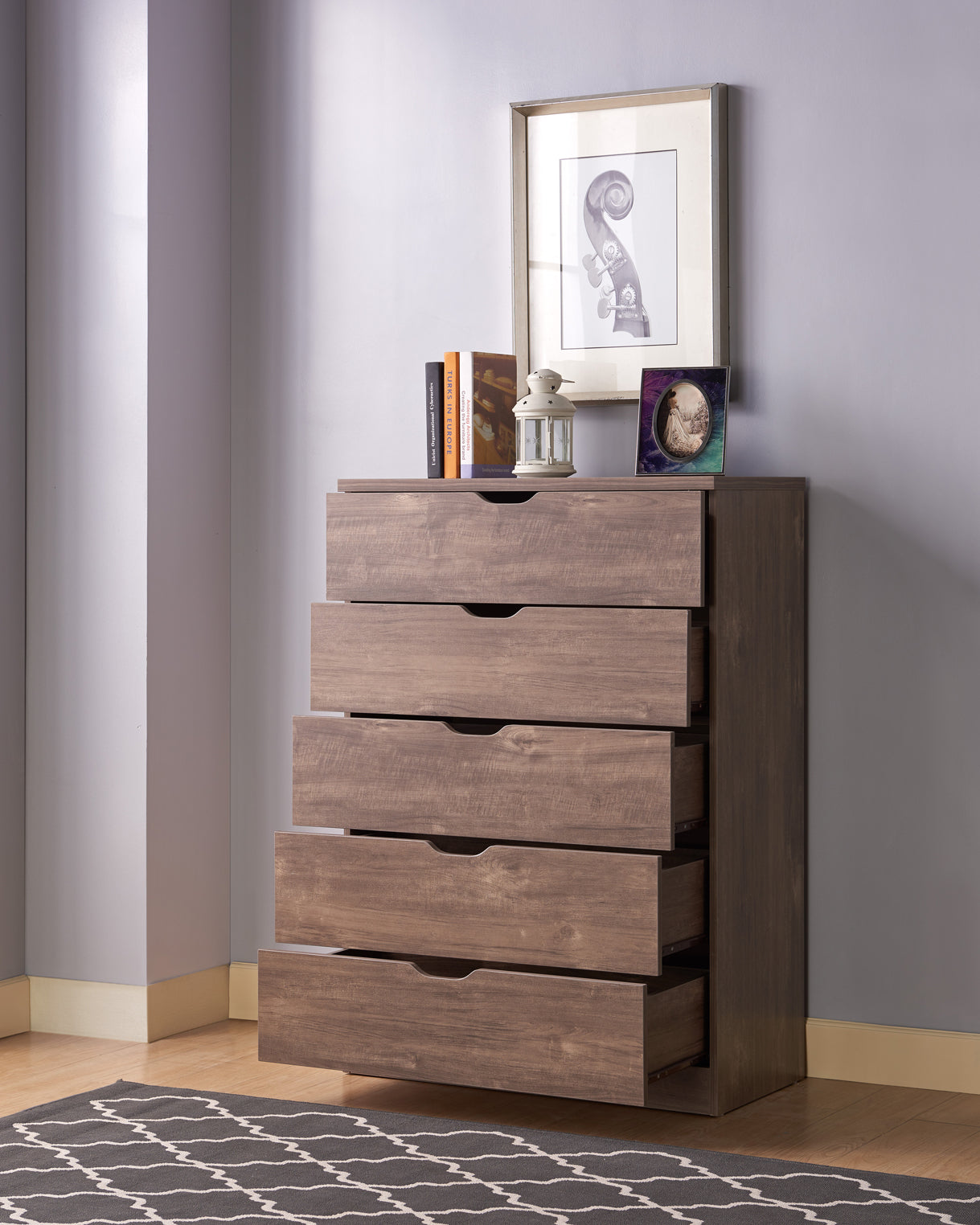 Modern Five Drawer Clothes And Storage Chest Cabinet With Cutout Handles In Hazelnut Color Brown Particle Board Mdf