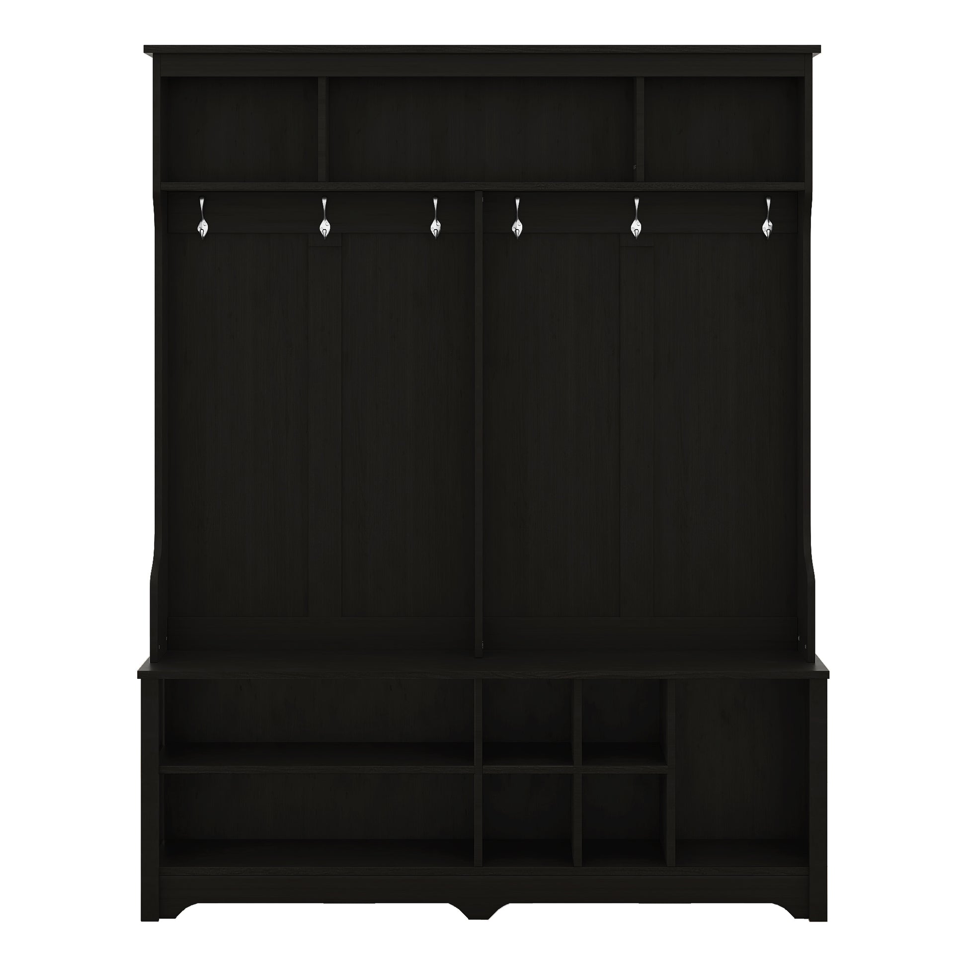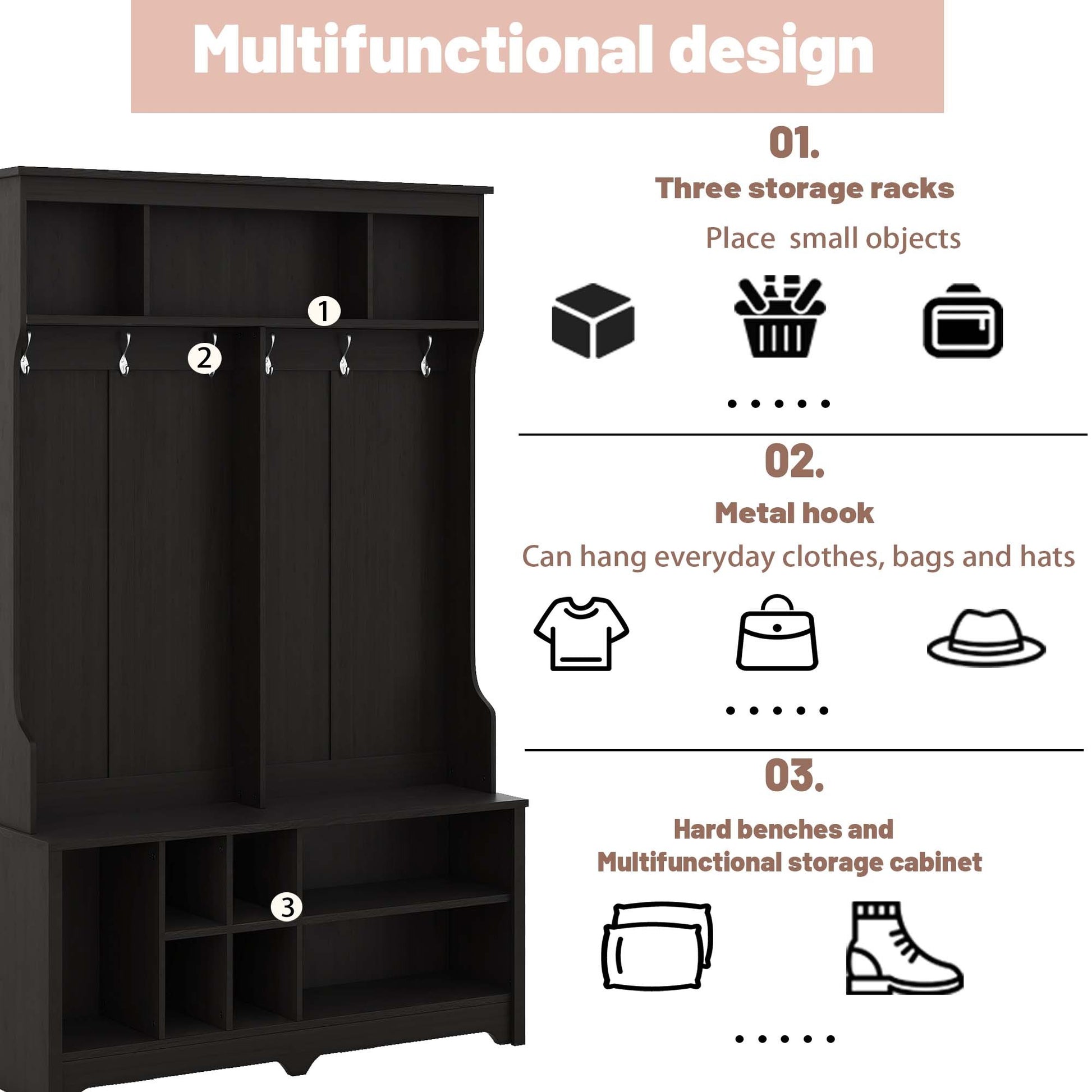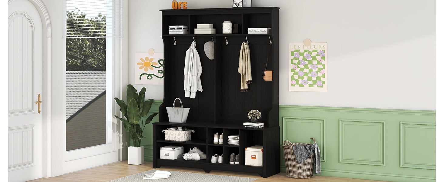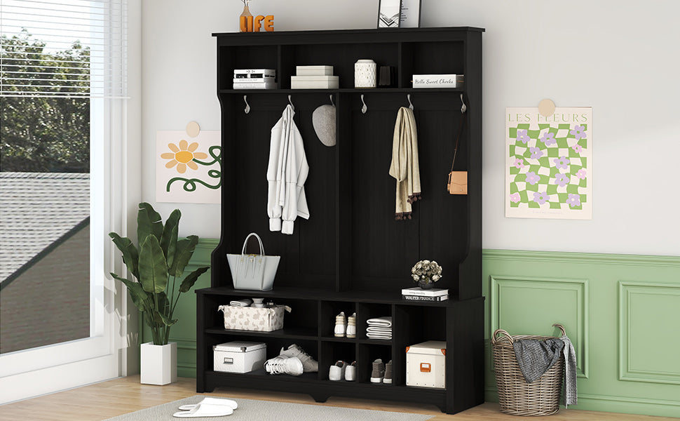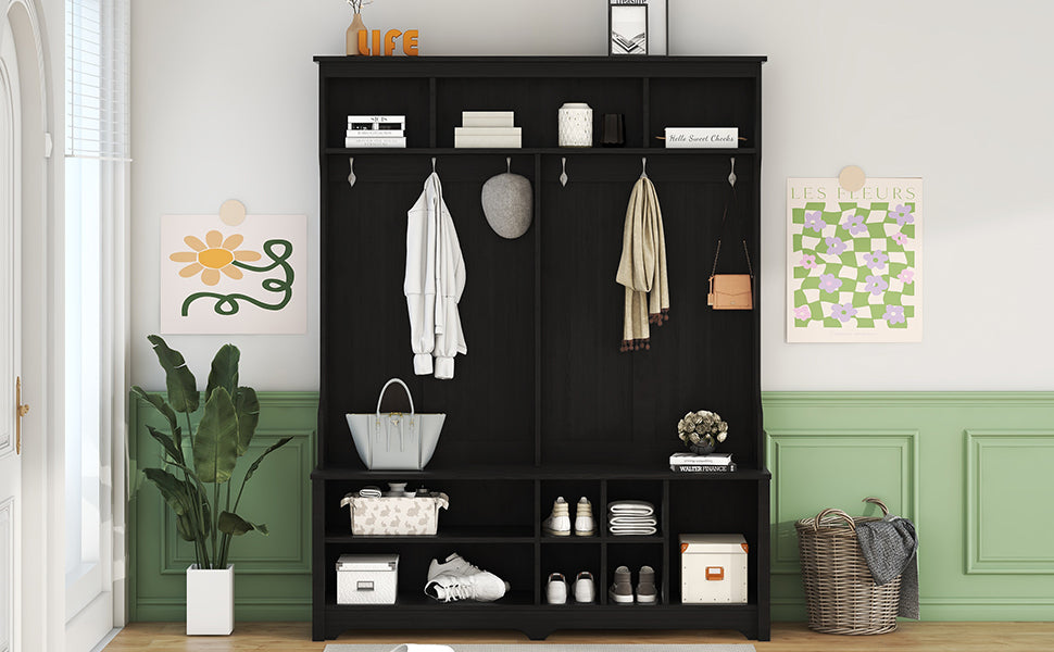 Modern Hallway Hall Tree With Metal Hooks And Storage Space, Multi Functional Entryway Coat Rack With Shoe Cubbies, Black Black Mdf