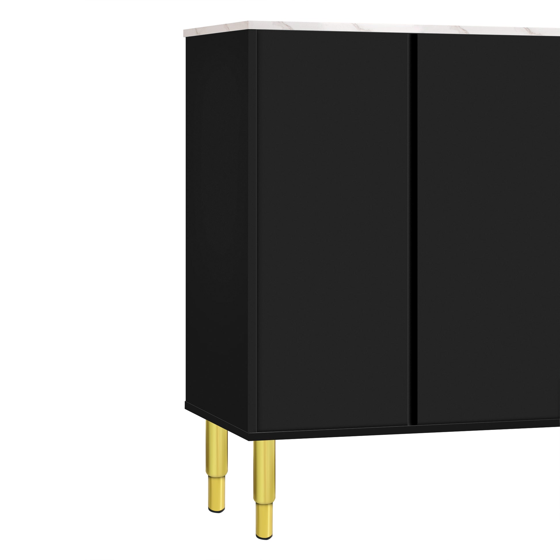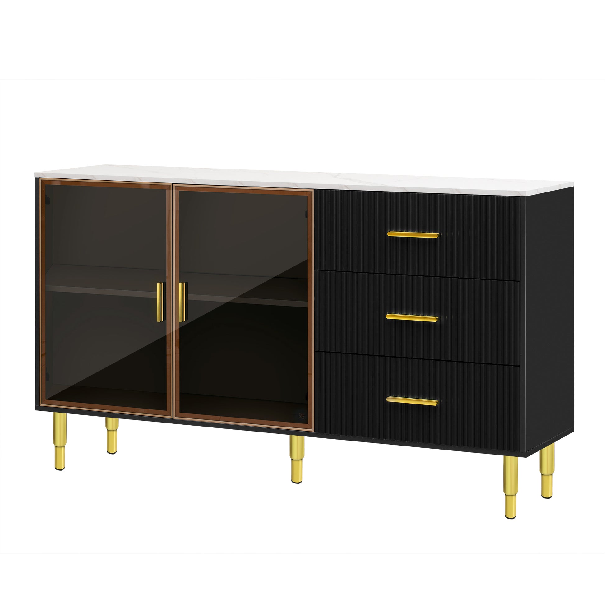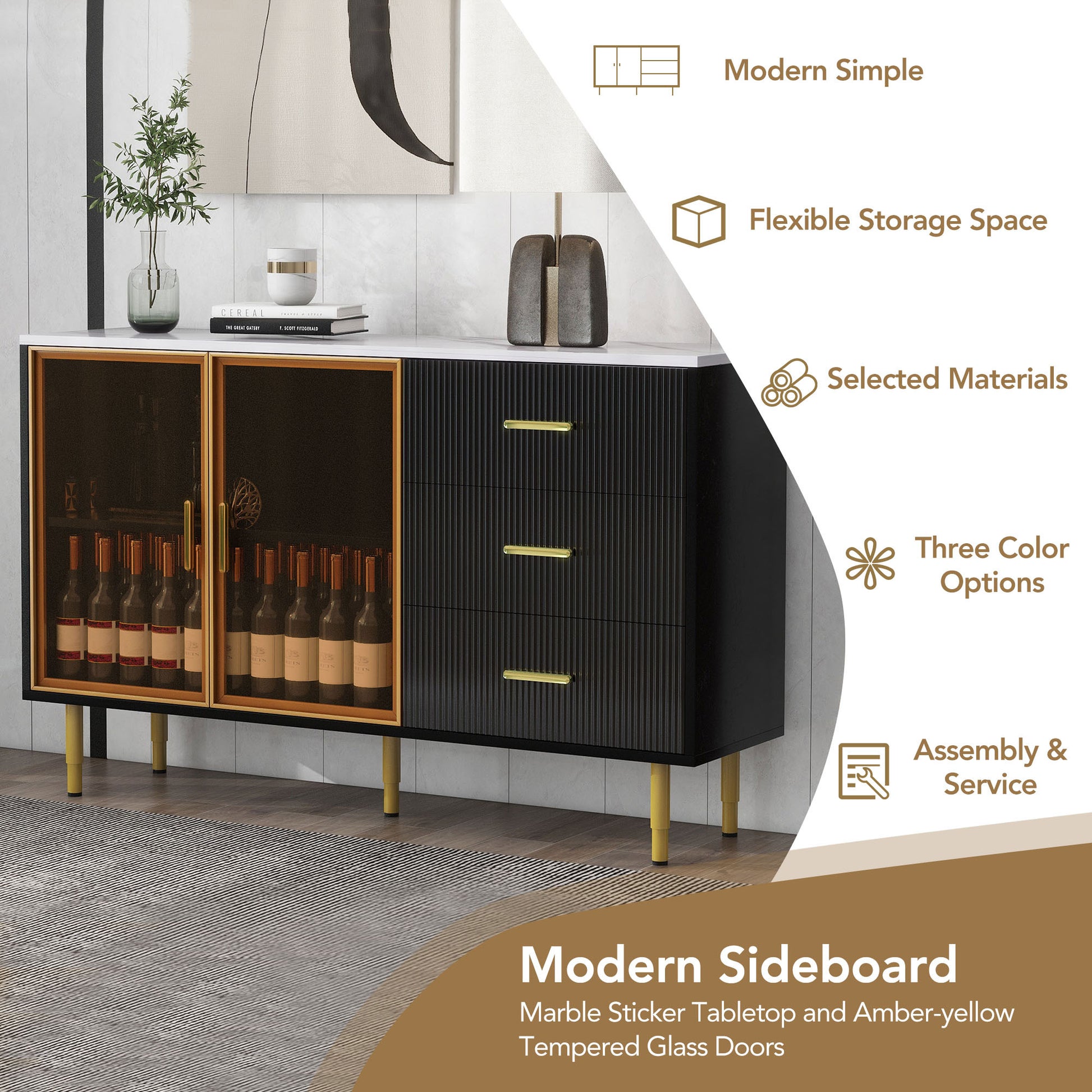Modern Sideboard Mdf Buffet Cabinet Marble Sticker Tabletop And Amber Yellow Tempered Glass Doors With Gold Metal Legs & Handles Black Black Mdf Glass