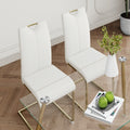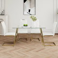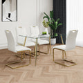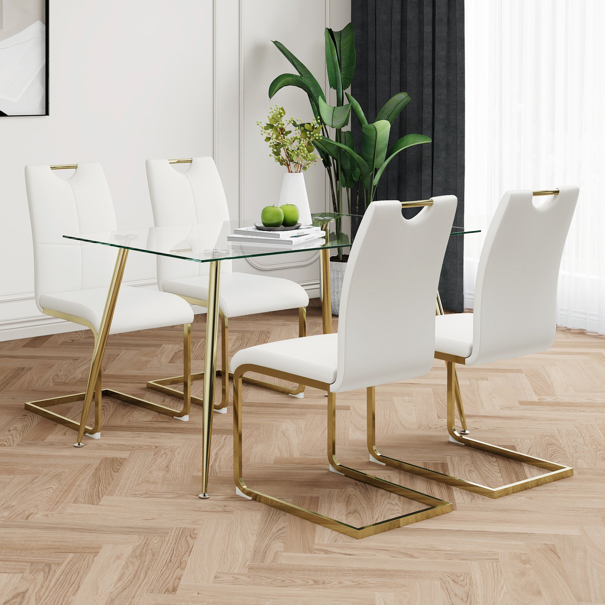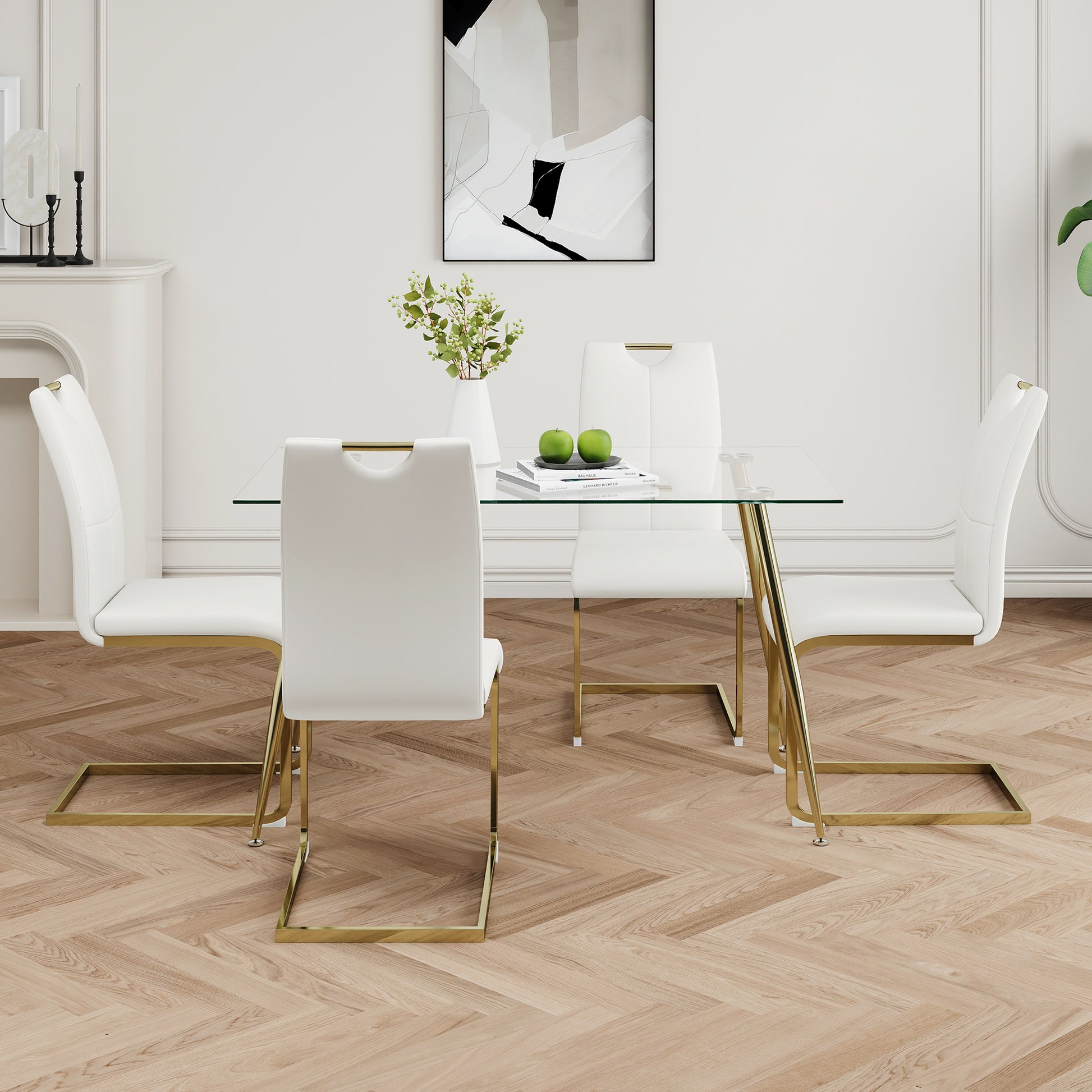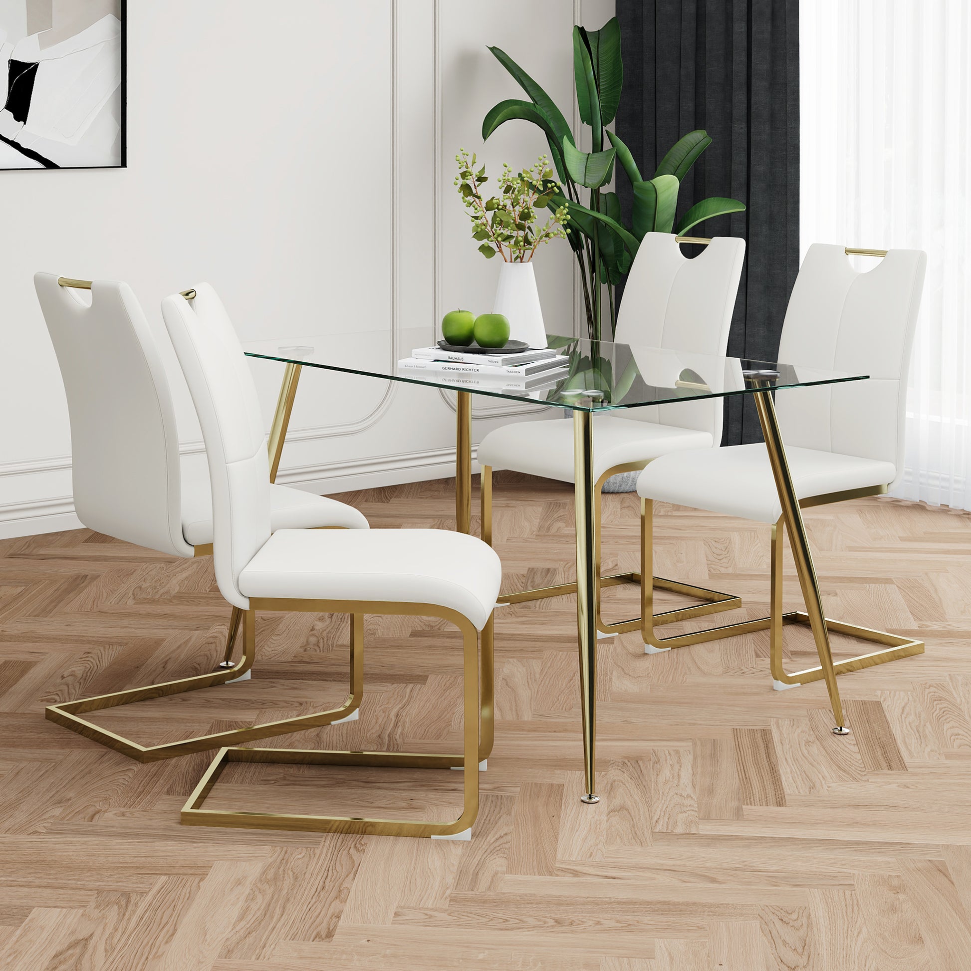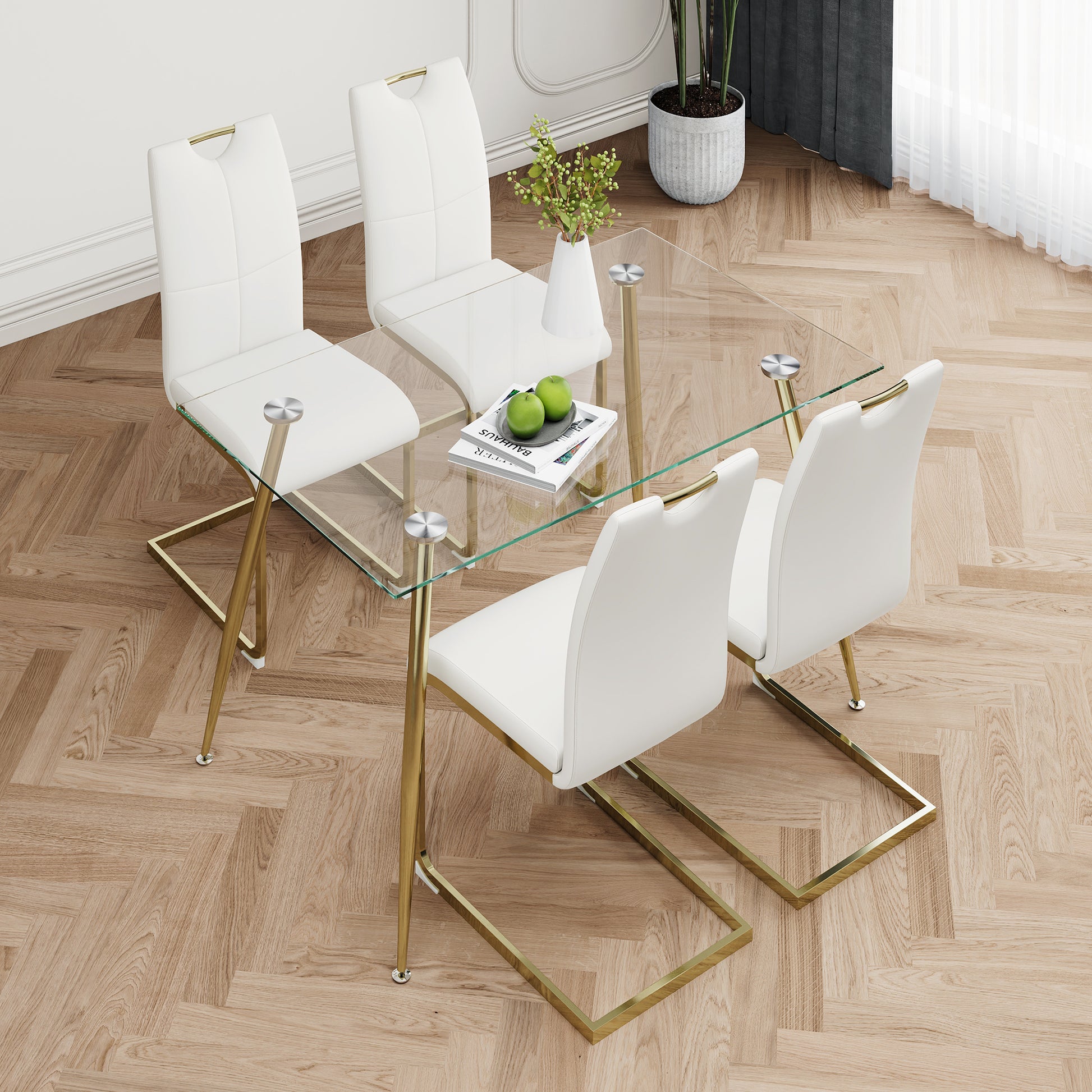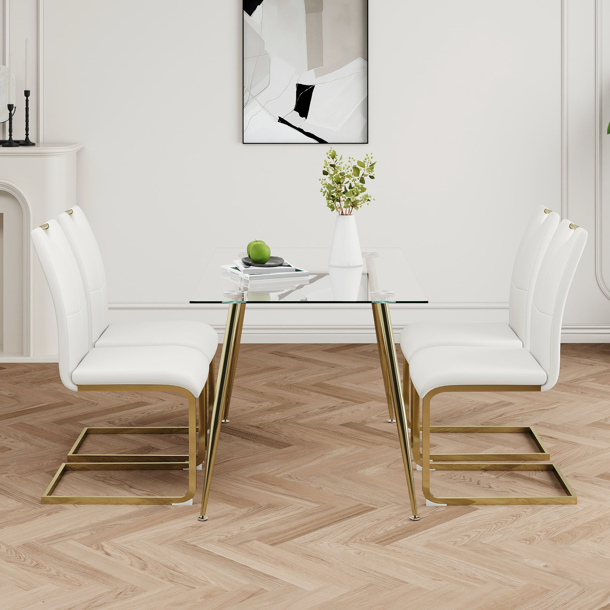Modern Simple Rectangular Glass Dining Table, Wear Resistant Tempered Glass Countertop, Gold Plated Legs, White Pu Dining Chair Set, Suitable For Restaurant Kitchen Use Set Of 5 Upholstered Chair