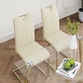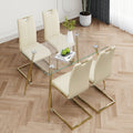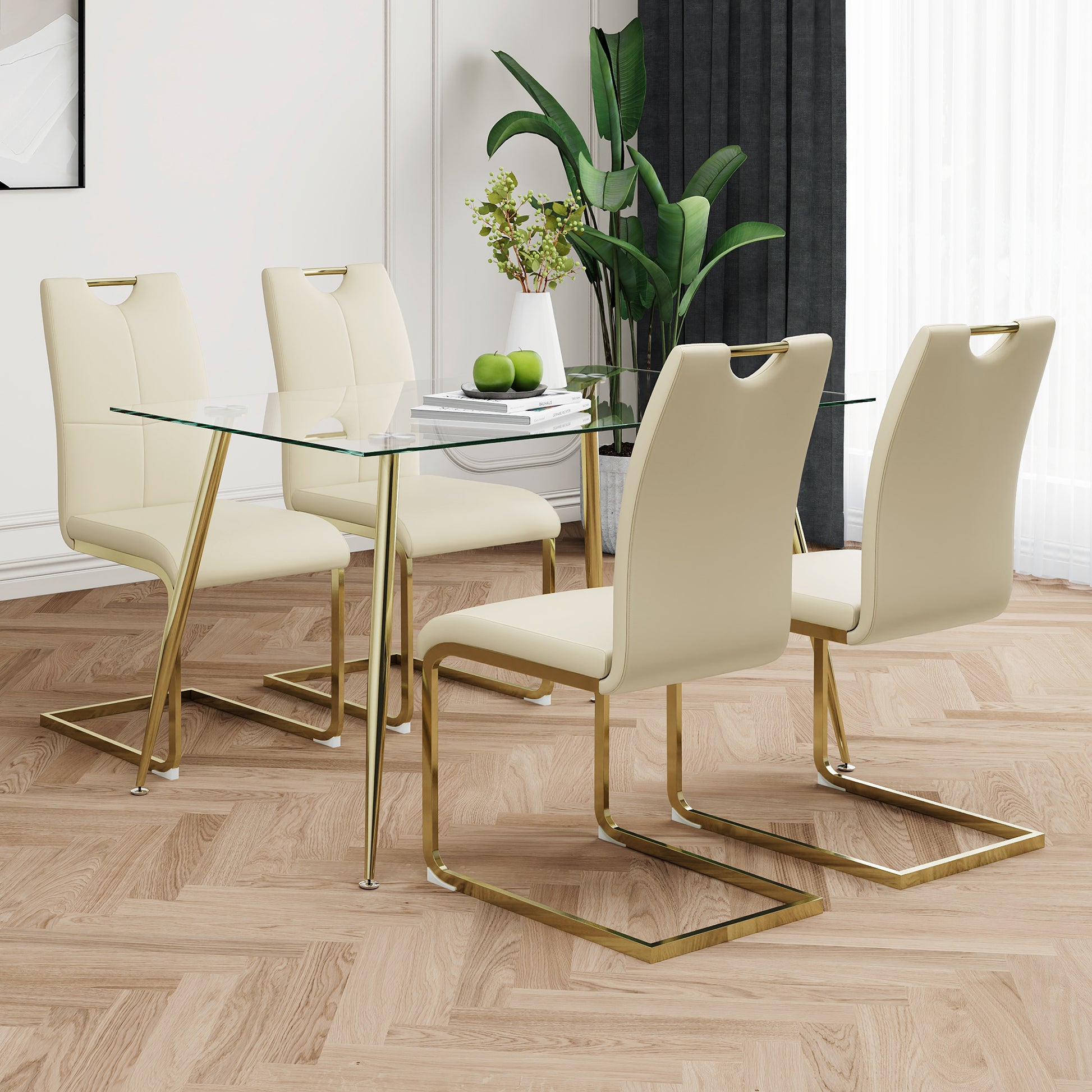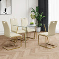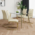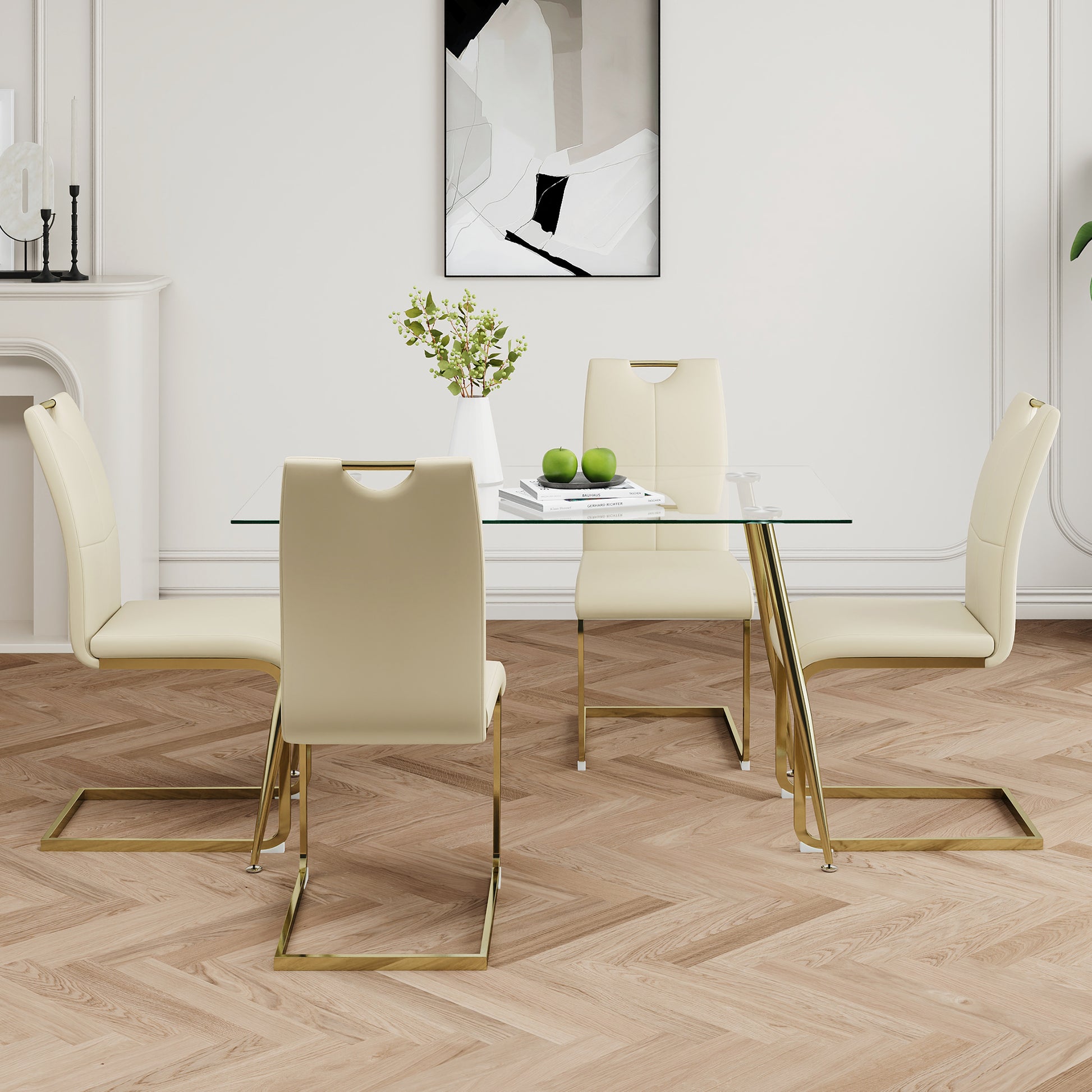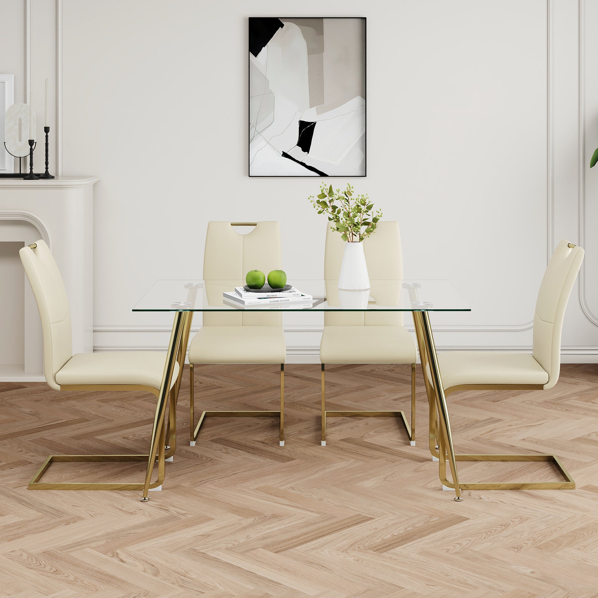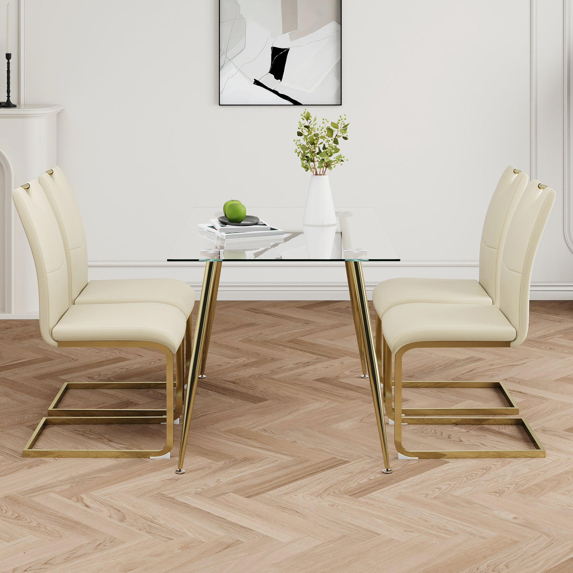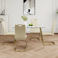Modern Simple Rectangular Glass Dining Table, Wear Resistant Tempered Glass Countertop, Gold Plated Legs, Light Yellow Pu Dining Chair Set, Suitable For Restaurant Kitchen Use Set Of 5 Upholstered
