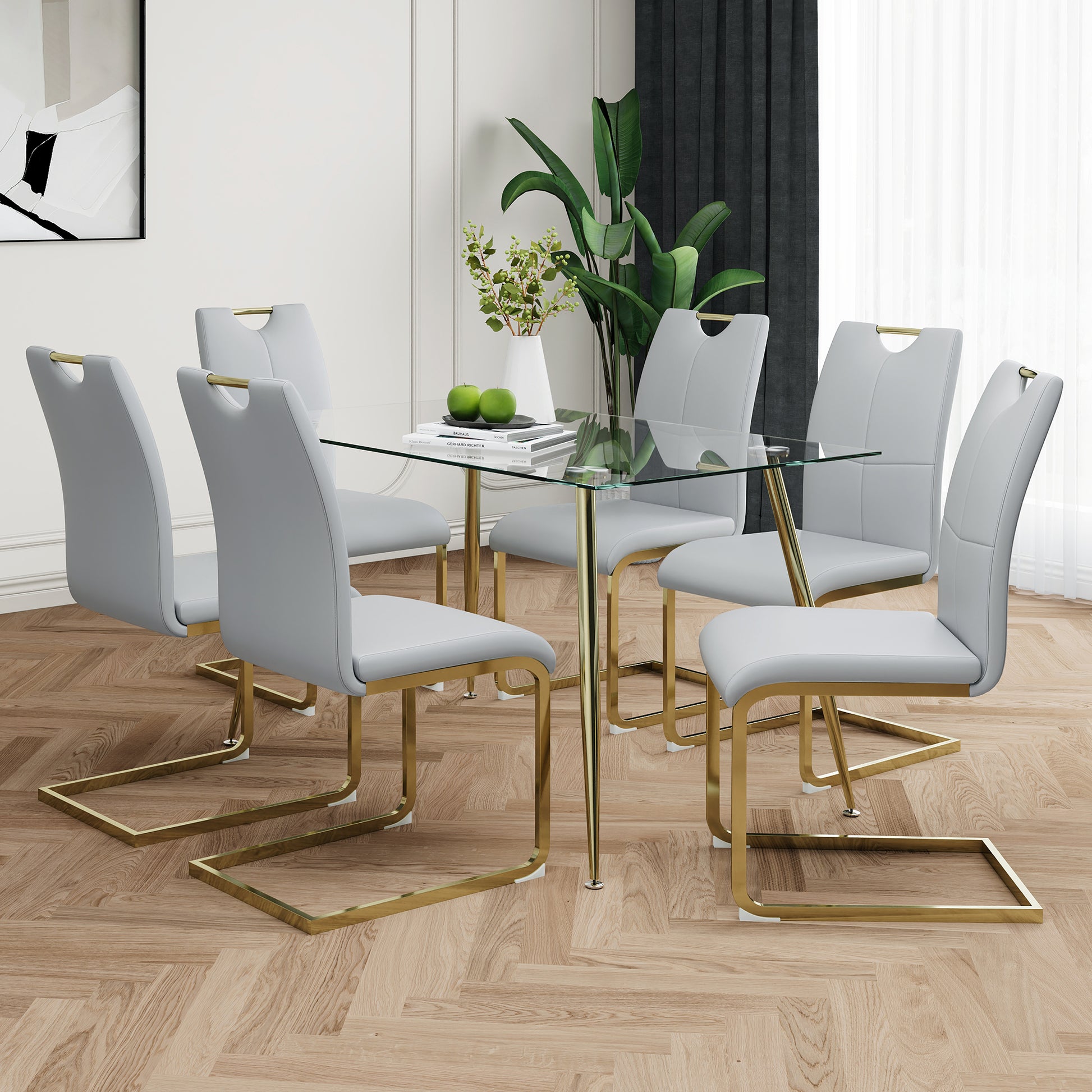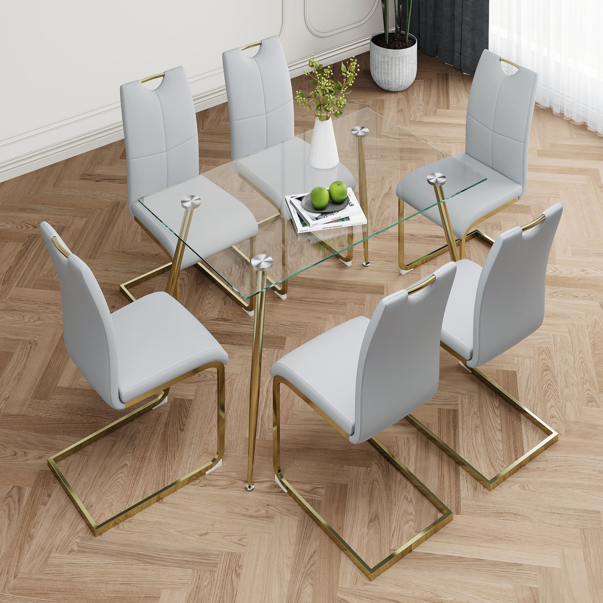 Modern Simple Rectangular Glass Dining Table, Wear Resistant Tempered Glass Countertop, Gold Plated Legs, Grey Pu Dining Chair Set, Suitable For Restaurant Kitchen Use Set Of 7 Upholstered Chair