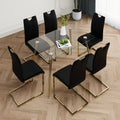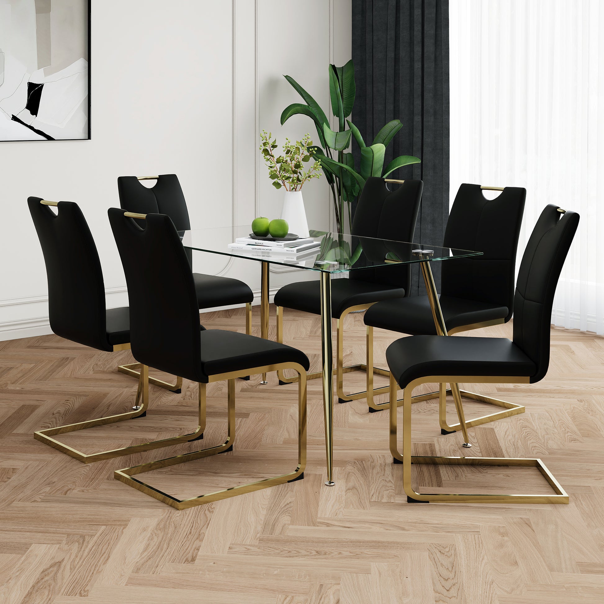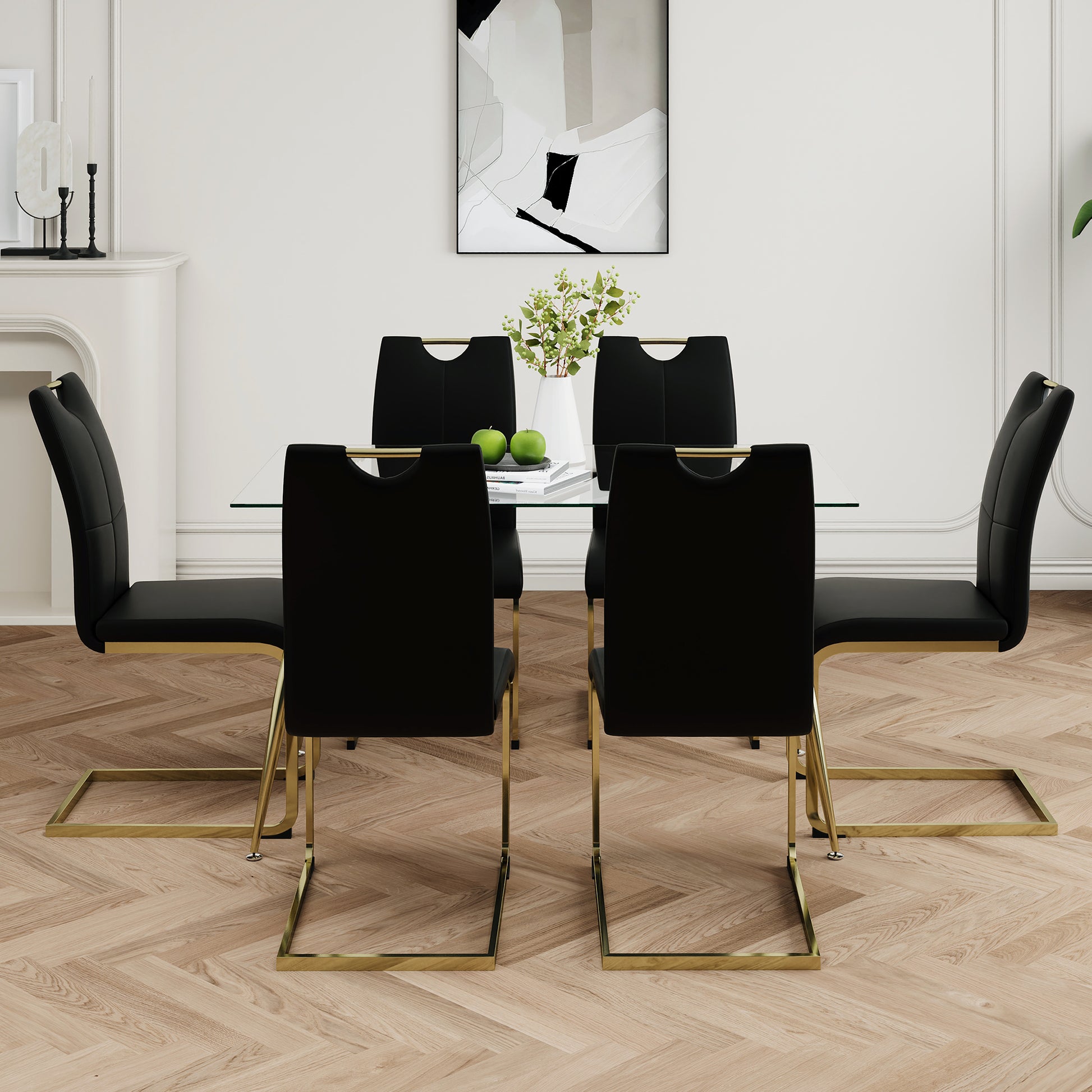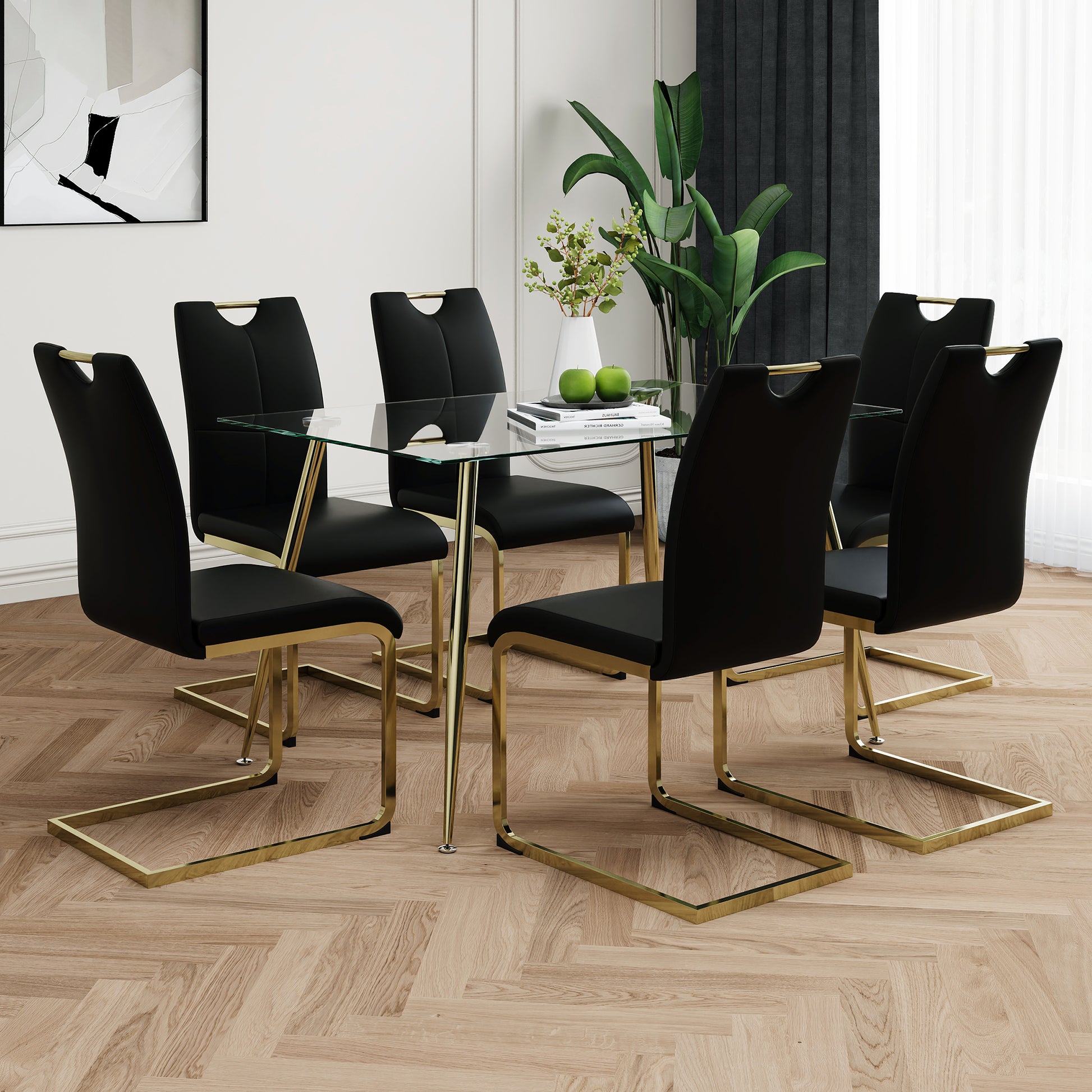 Modern Simple Rectangular Glass Dining Table, Wear Resistant Tempered Glass Countertop, Gold Plated Legs, Black Pu Dining Chair Set, Suitable For Restaurant Kitchen Use Set Of 7 Upholstered Chair
