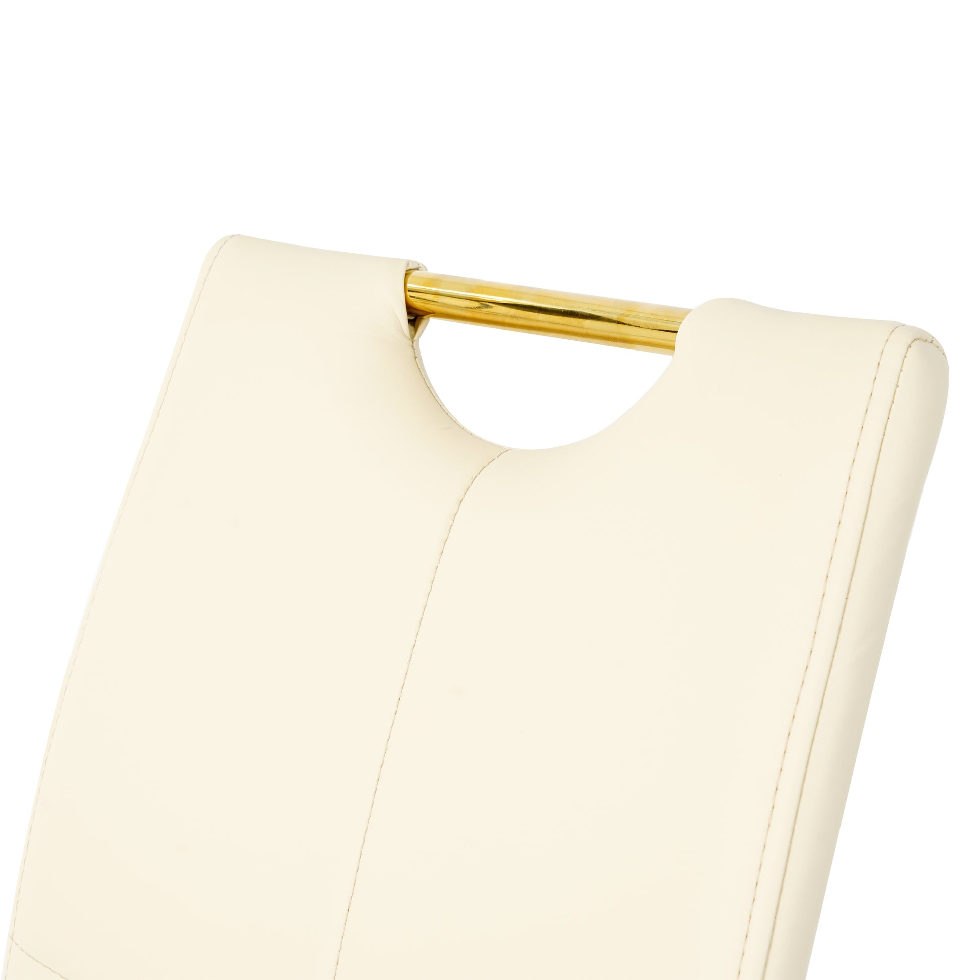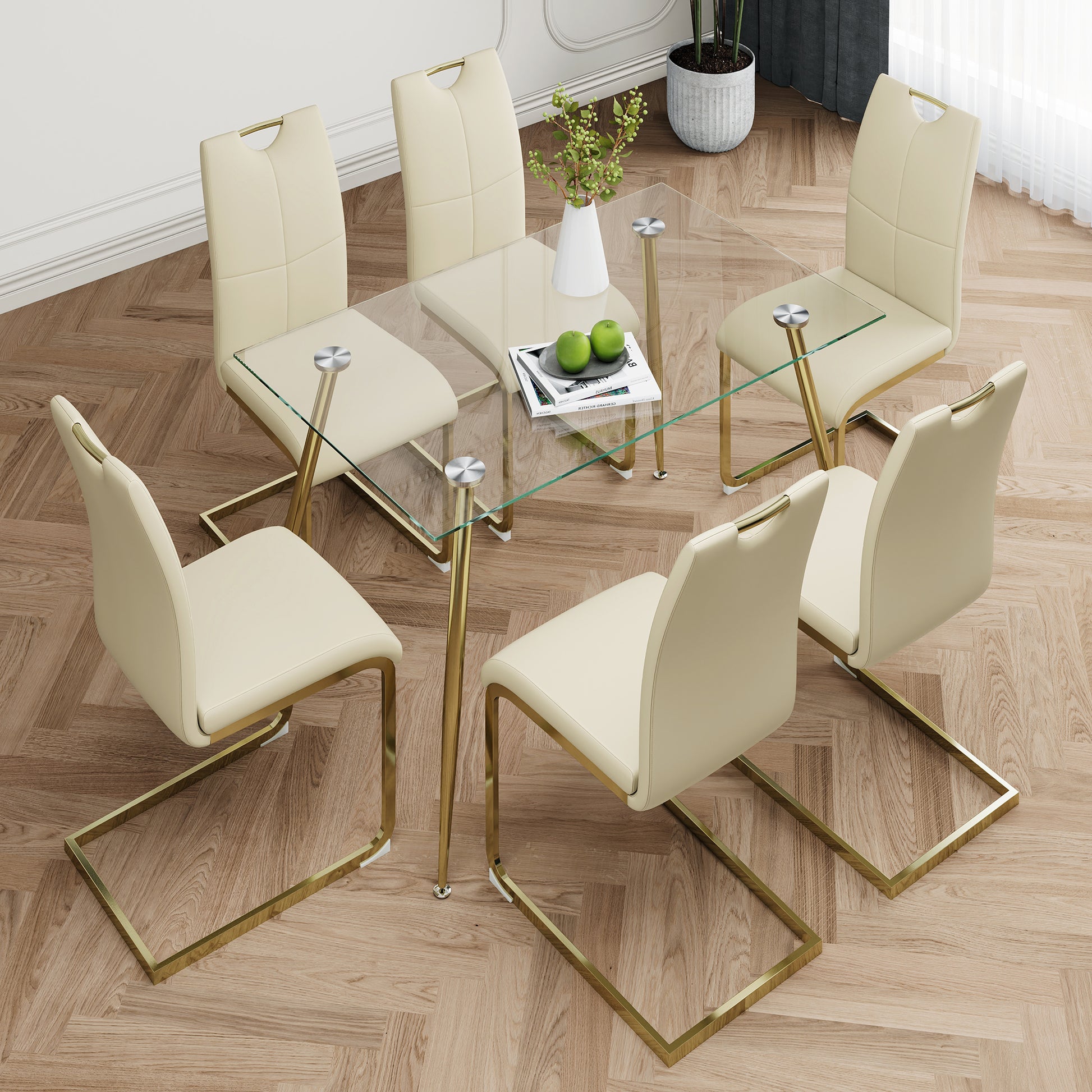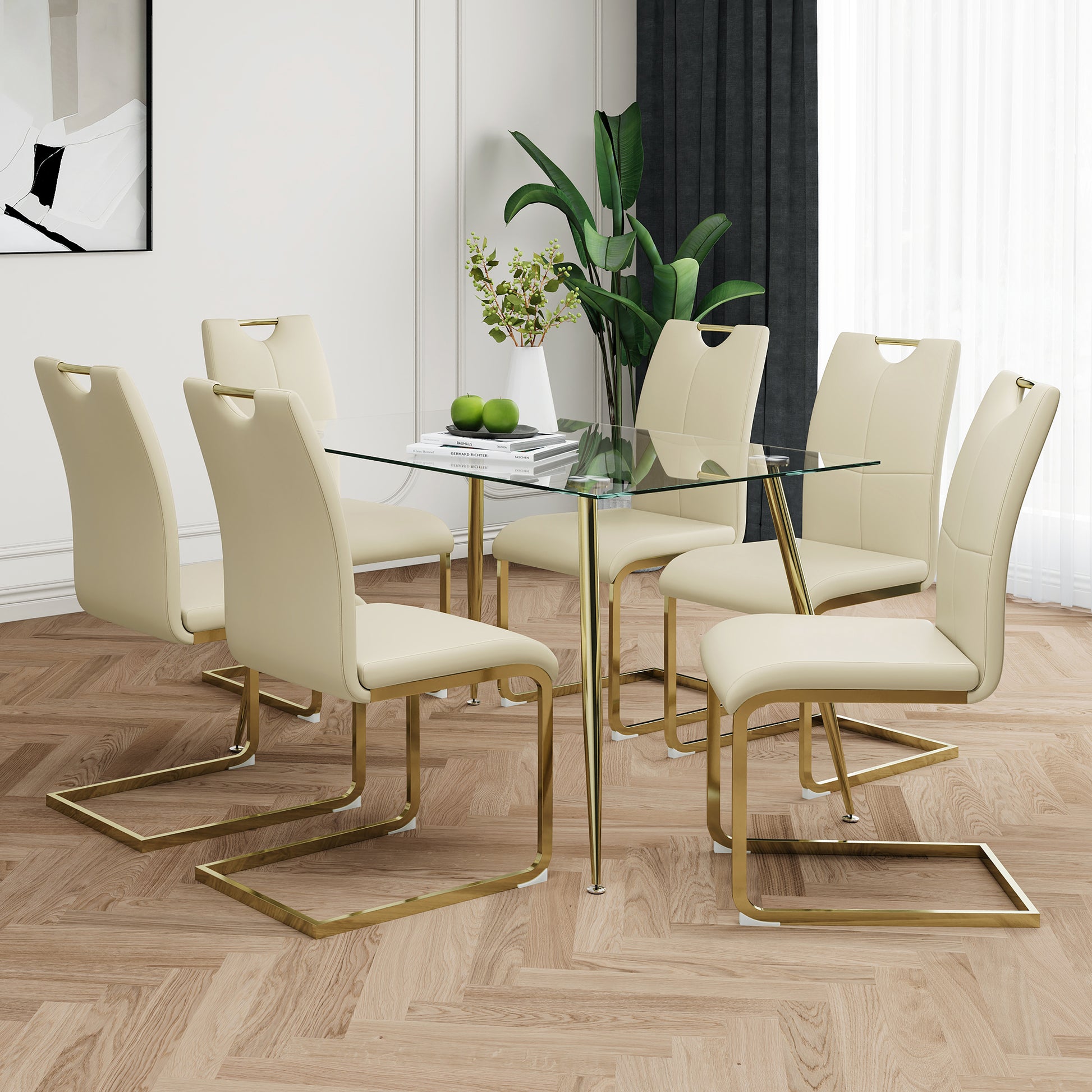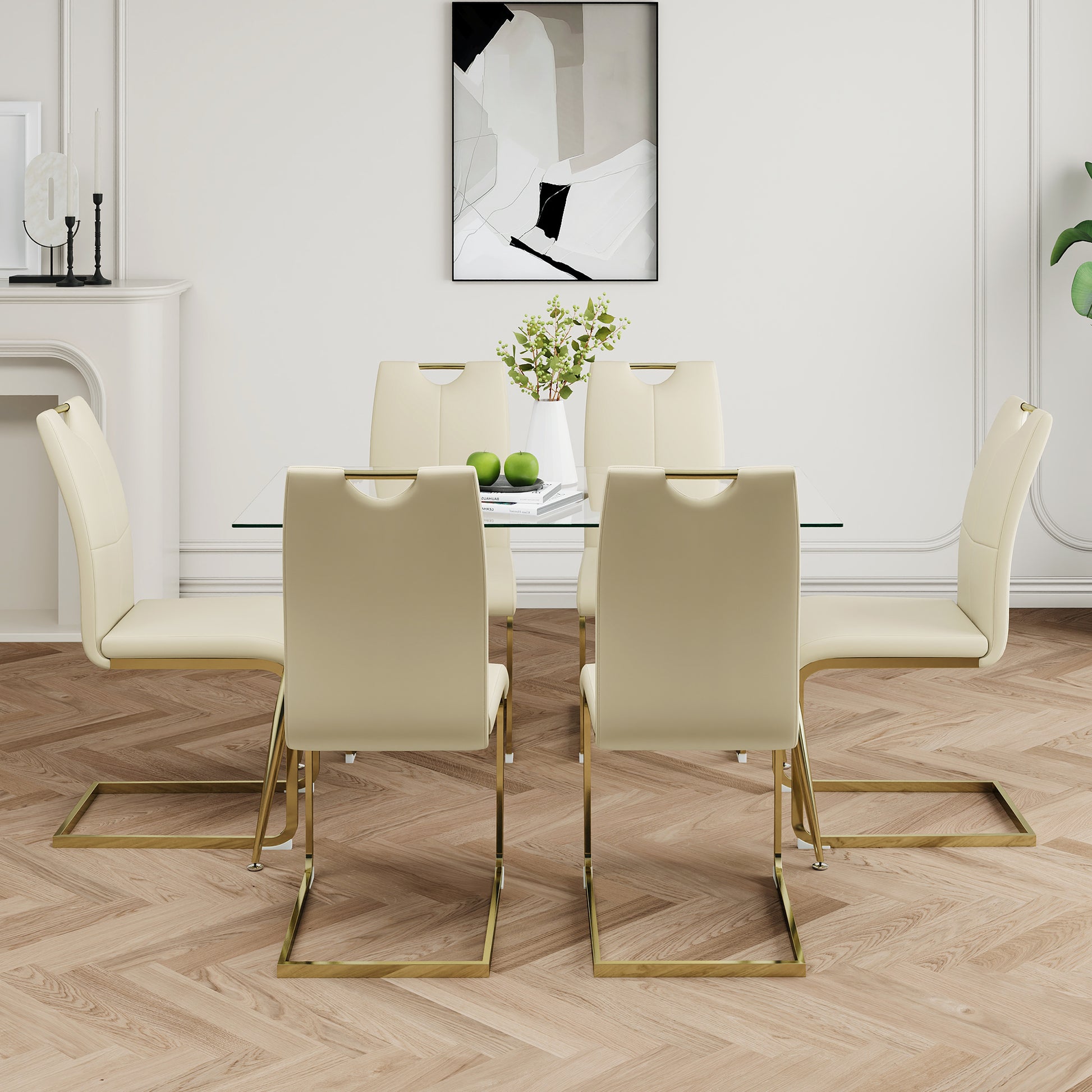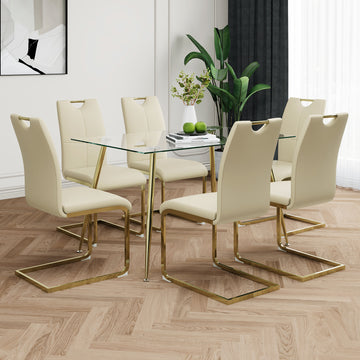 Modern Simple Rectangular Glass Dining Table, Wear Resistant Tempered Glass Countertop, Gold Plated Legs, Light Yellow Pu Dining Chair Set, Suitable For Restaurant Kitchen Use Set Of 7 Upholstered