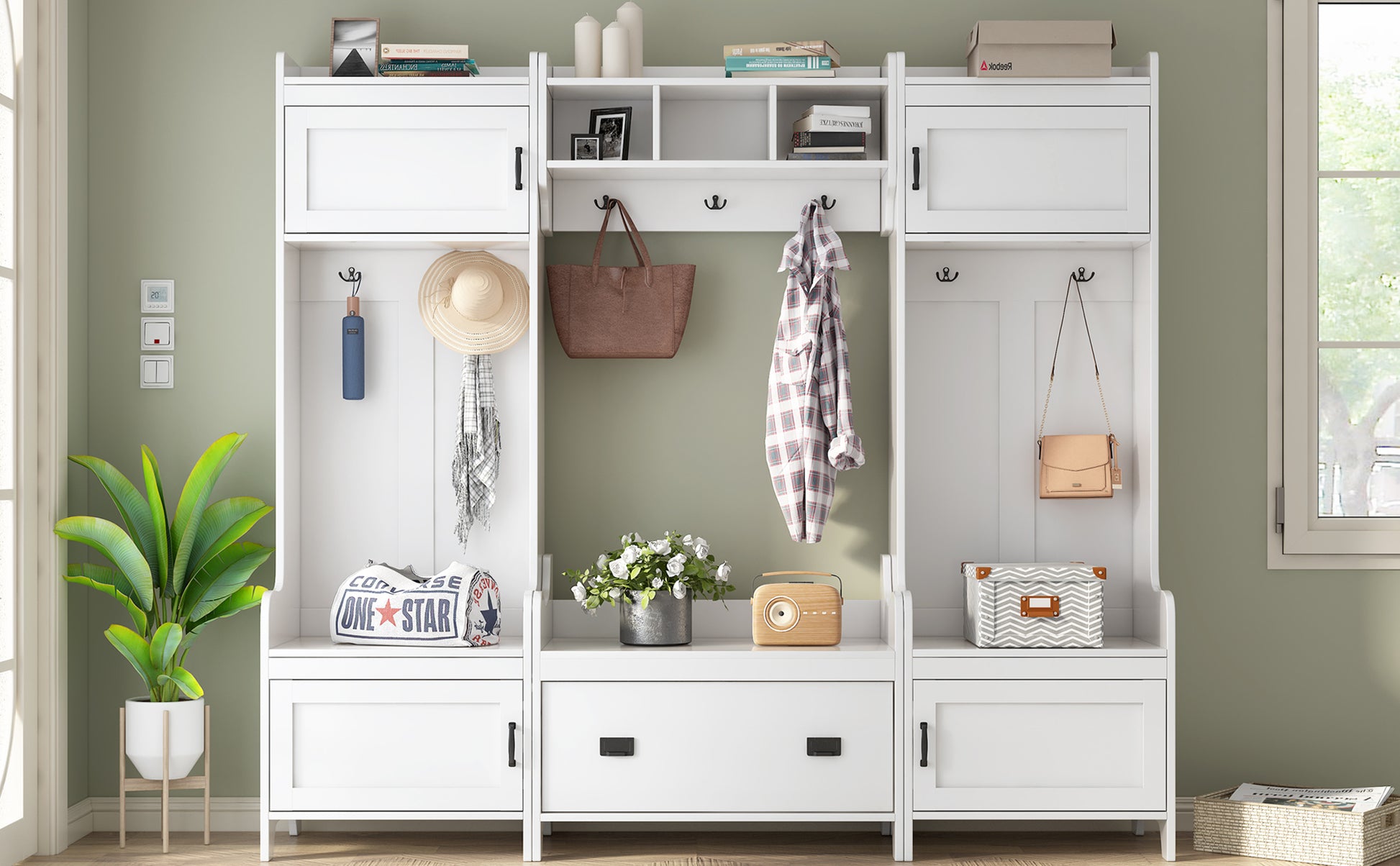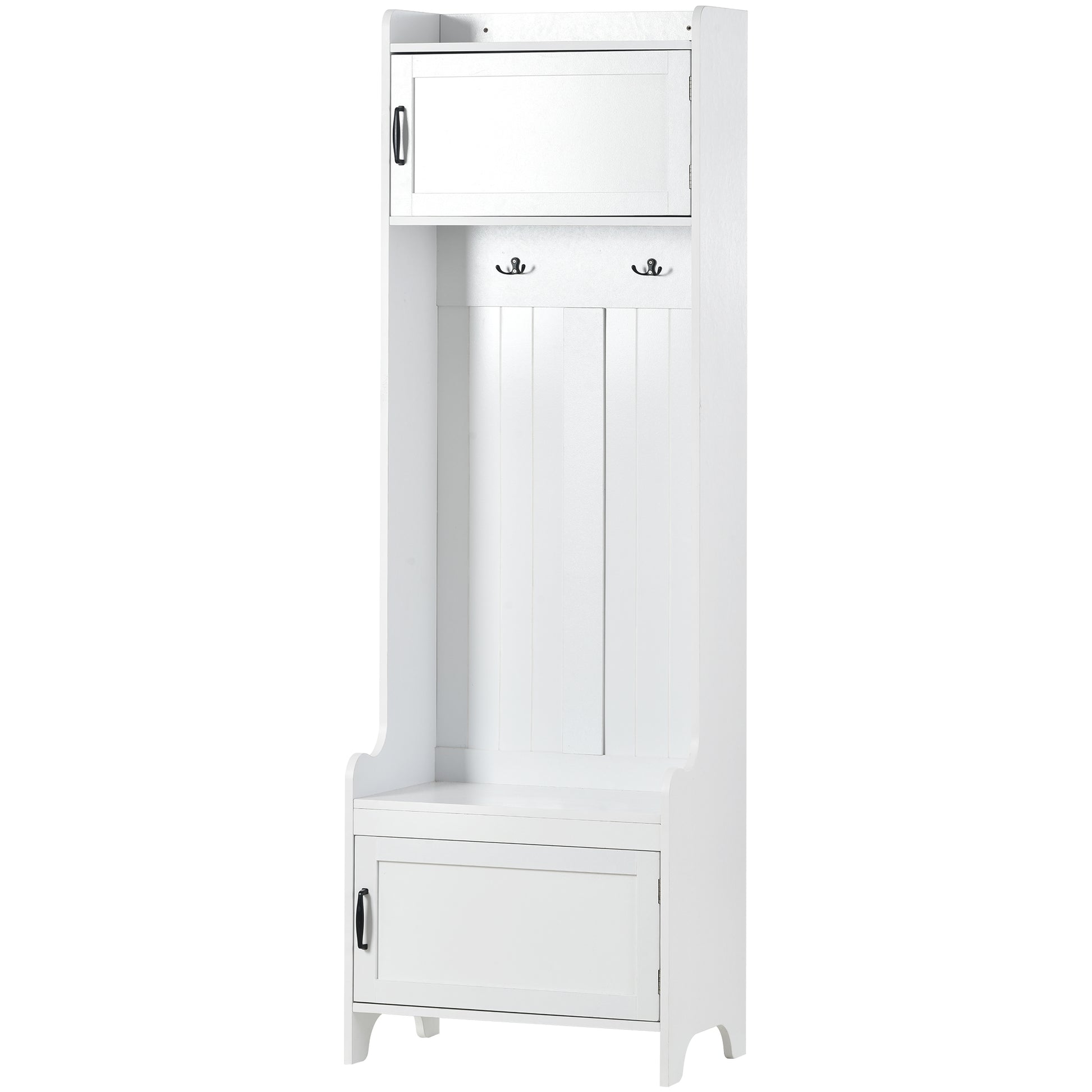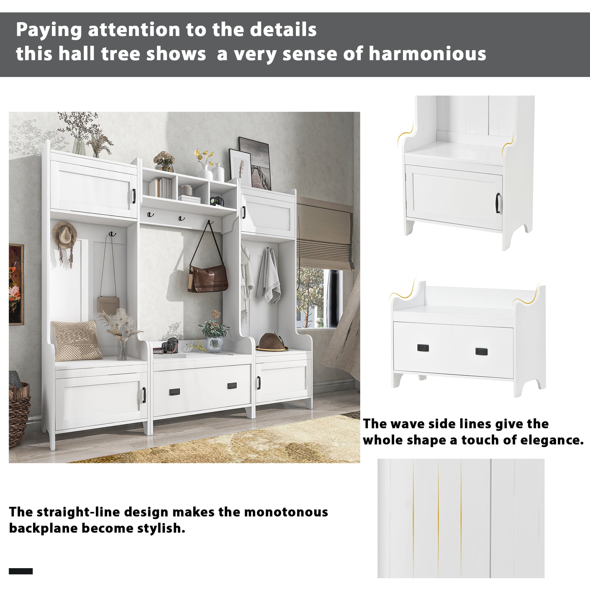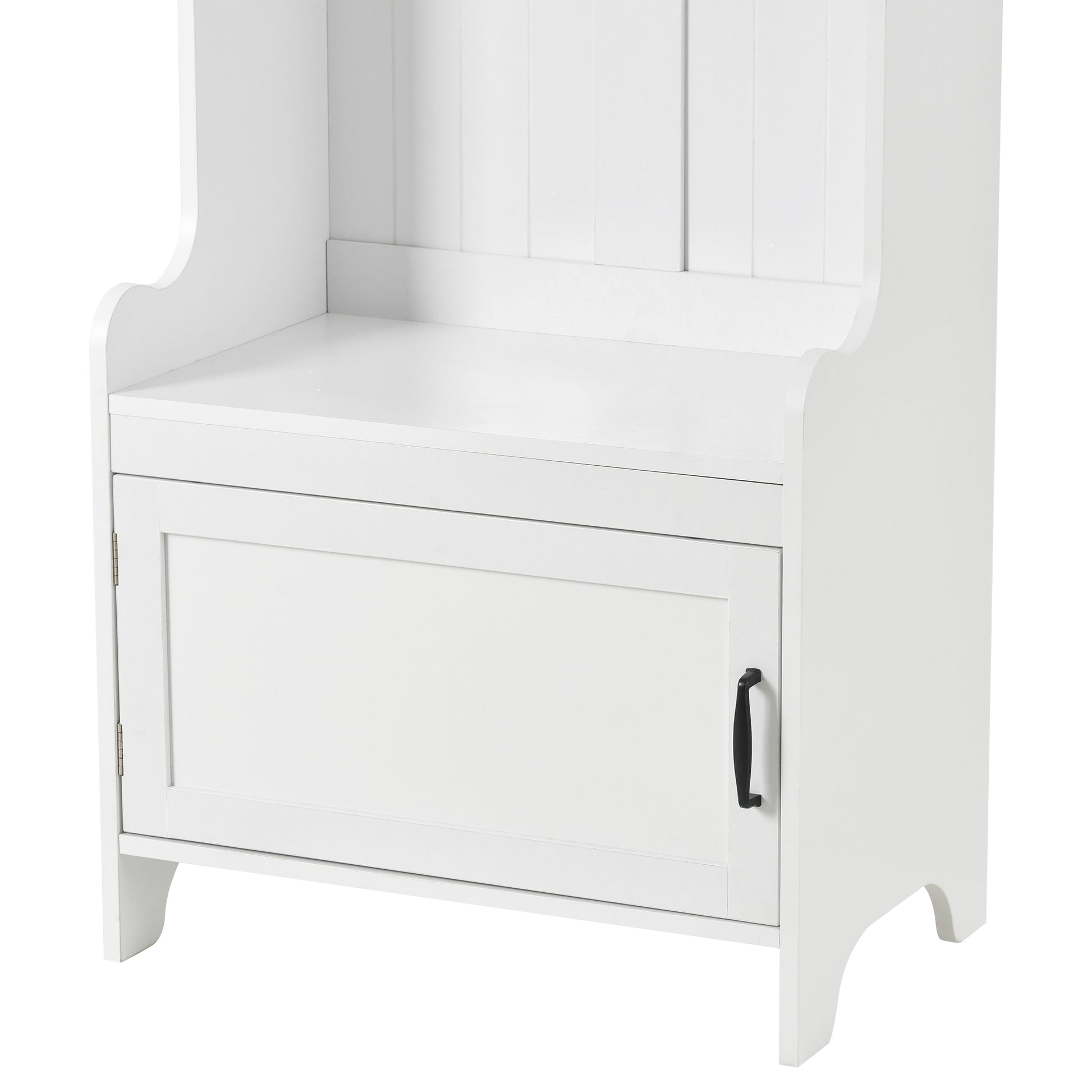 Modern Style 4 In 1 Multiple Functions Hallway Coat Rack With Seven Metal Black Hooks, Entryway Bench Hall Tree With Large Storage Drawer, White Old Sku: Sd000006Aak White Particle Board