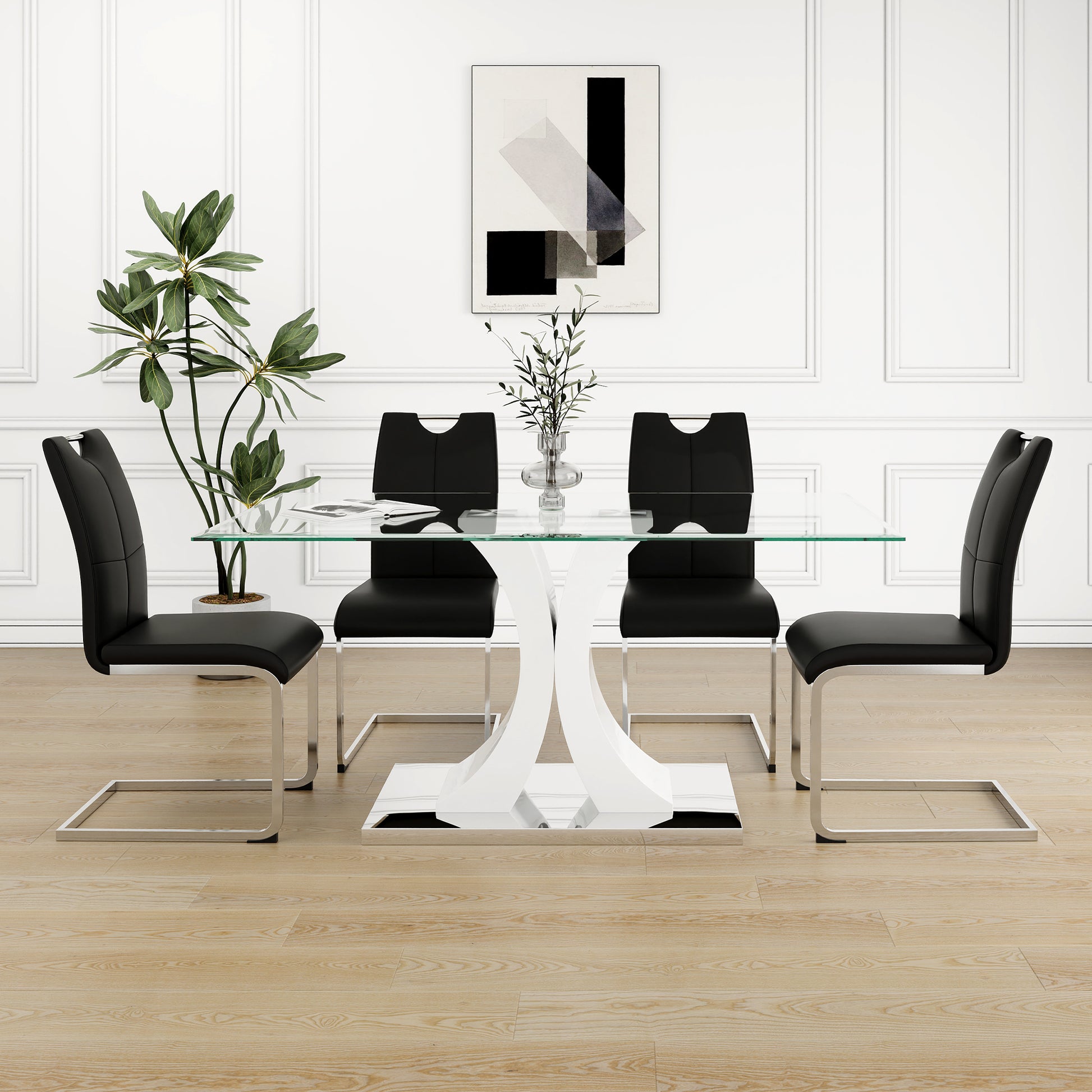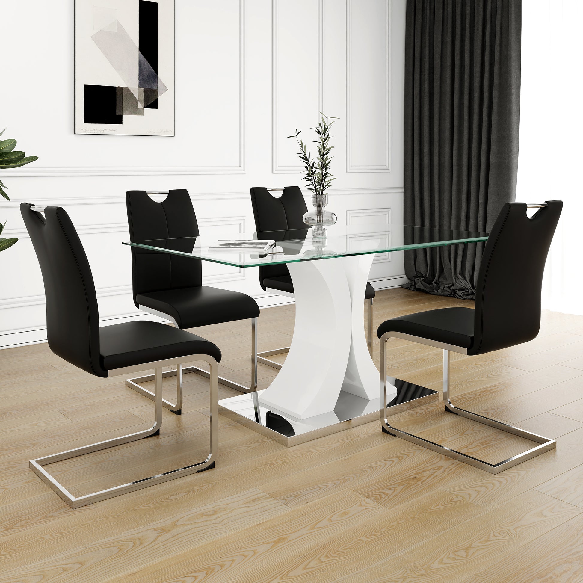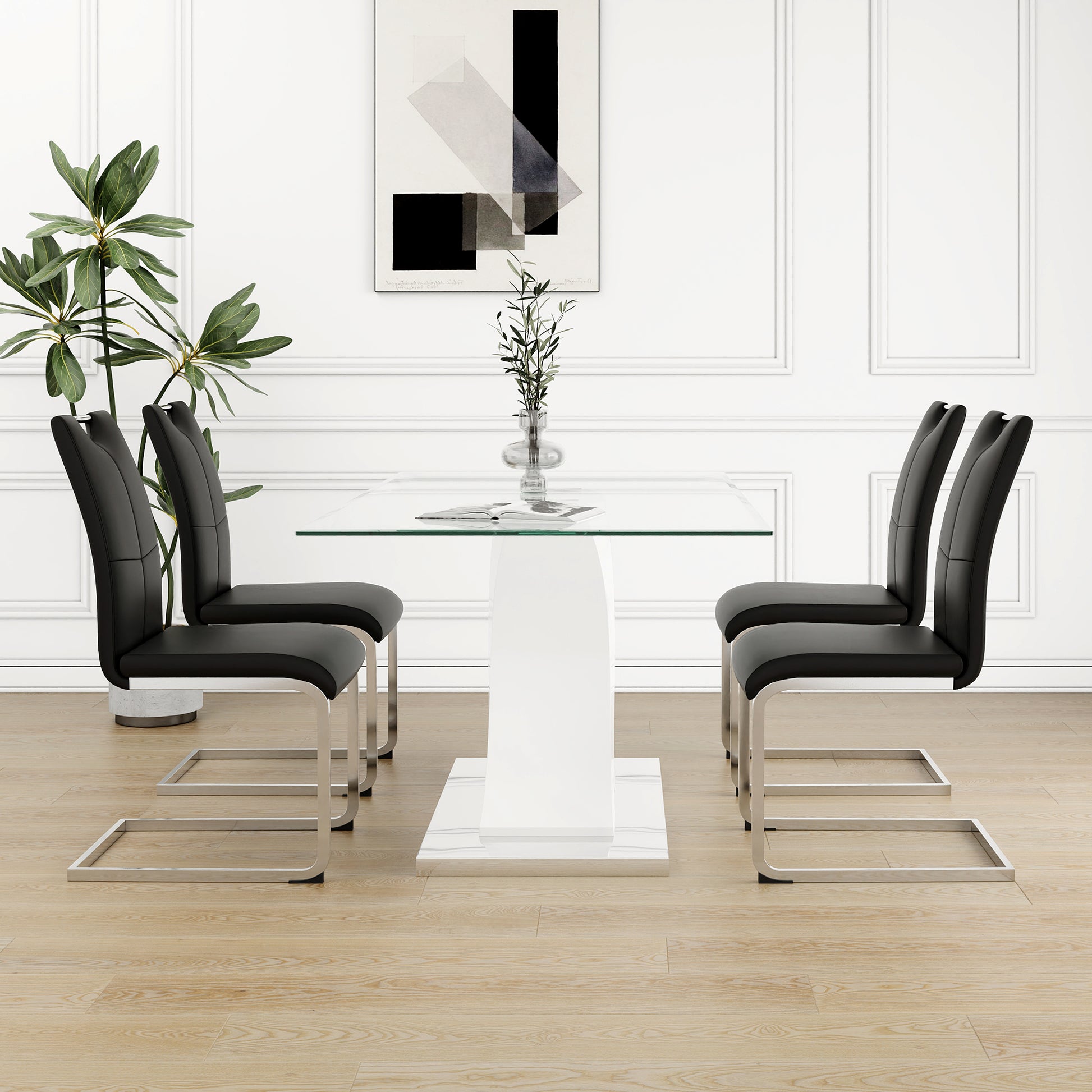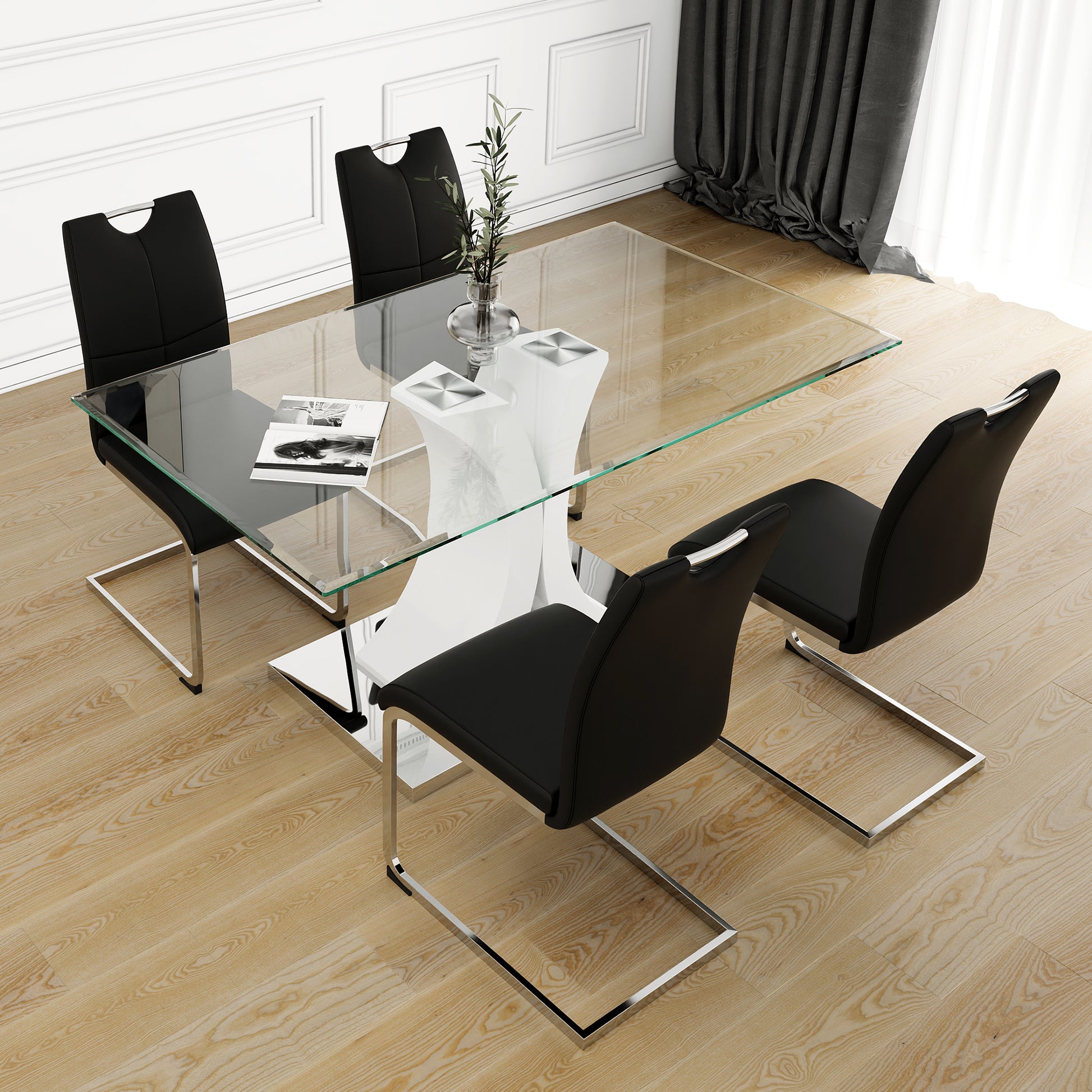 Modern Style Glass Table, Elegant Transparent Design, Durable Support Base, Black Dining Chair Set, Electroplated Chair Legs, Suitable For Restaurant Kitchens Set Of 5 Black Silver Seats 4 Mdf Glass