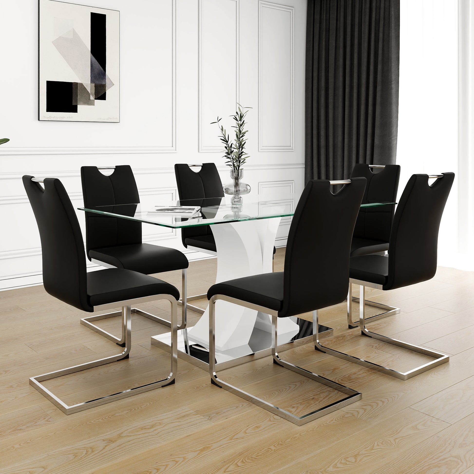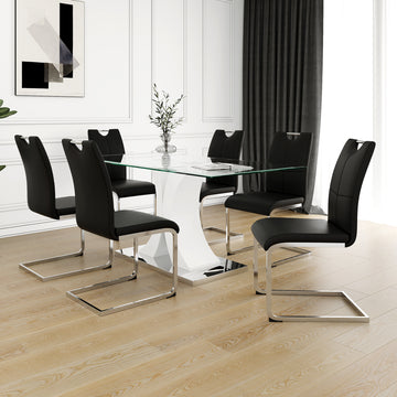 Modern Style Glass Table, Elegant Transparent Design, Durable Support Base, Black Dining Chair Set, Electroplated Chair Legs, Suitable For Restaurant Kitchens Set Of 7 Black Pu Mdf Metal