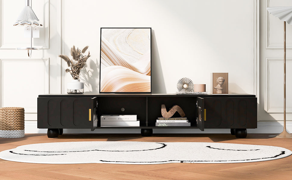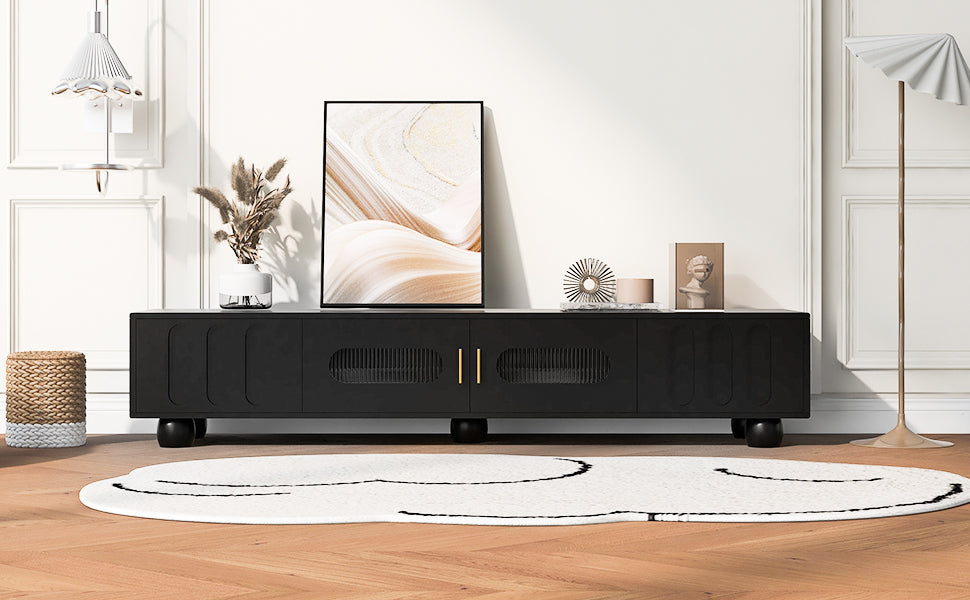 Modern Tv Stand For Tvs Up To 80 Inches, Entertainment Center With Glass Door, 2 Drawers And Cabinets, Wood Tv Storage Cabinet With Solid Wood Legs And Metal Handles For Living Room Black Mdf