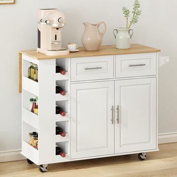 Multi Functional Kitchen Island Cart With 2 Door Cabinet And Two Drawers,Spice Rack, Towel Holder, Wine Rack, And Foldable Rubberwood Table Top White White Mdf
