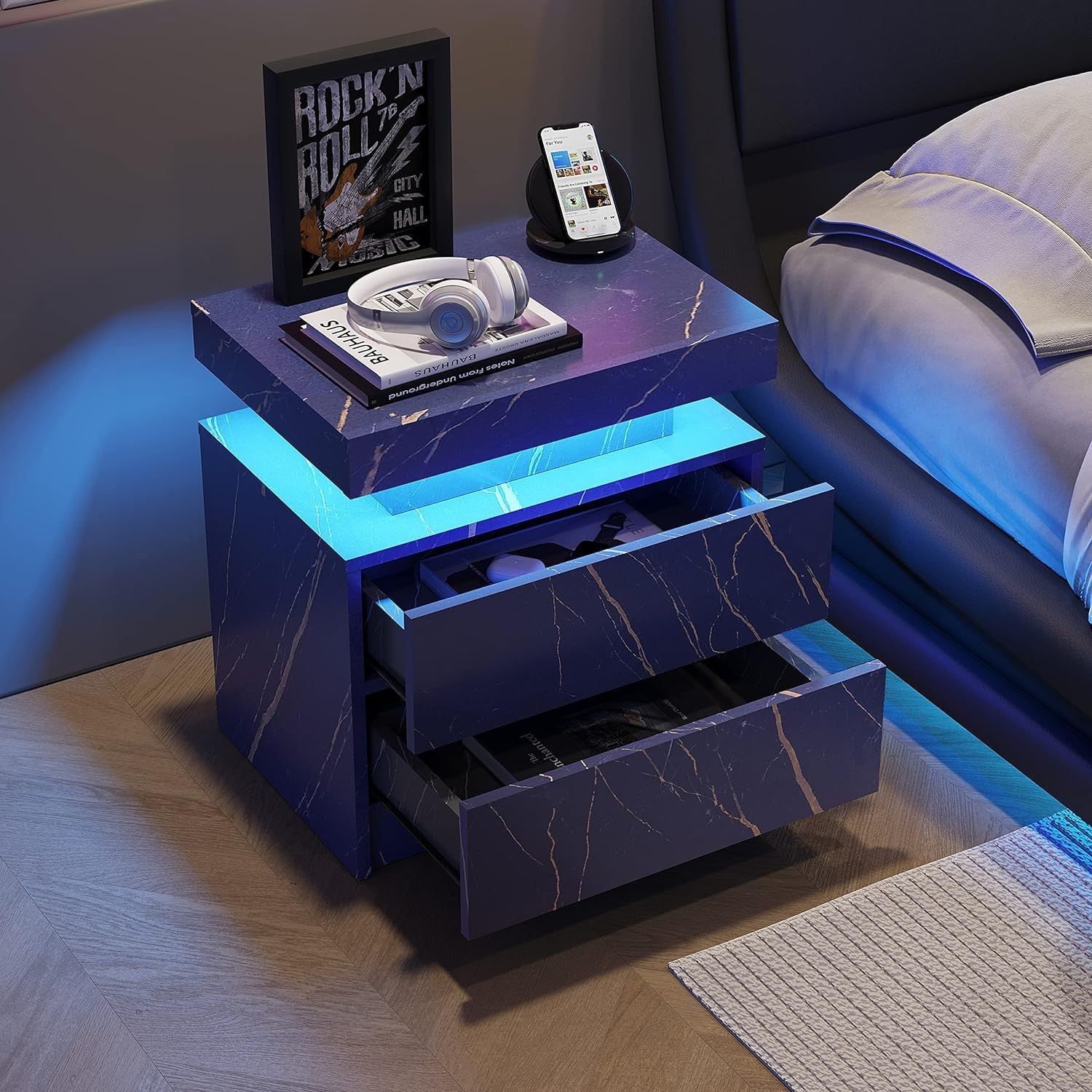 Nightstand Led Bedside Table Cabinet Lights Modern End Side With 2 Drawers For Bedroom Blue Gold Blue Gold 2 Drawers Bedroom Drawer Storage American Design,American Traditional,Boho,Casual,Classic Drawers Wood Engineered Wood