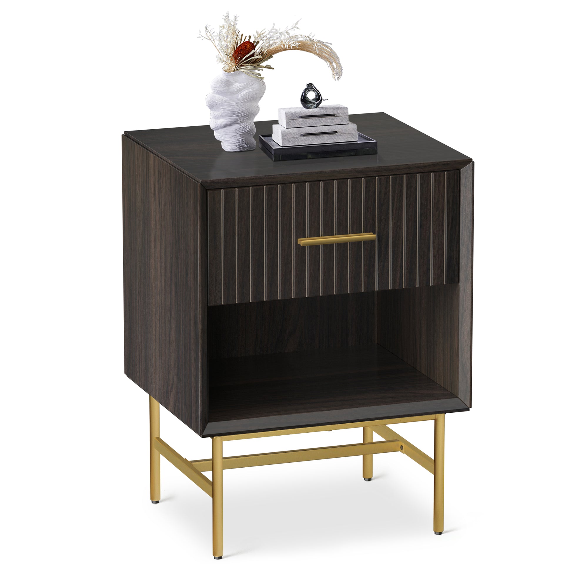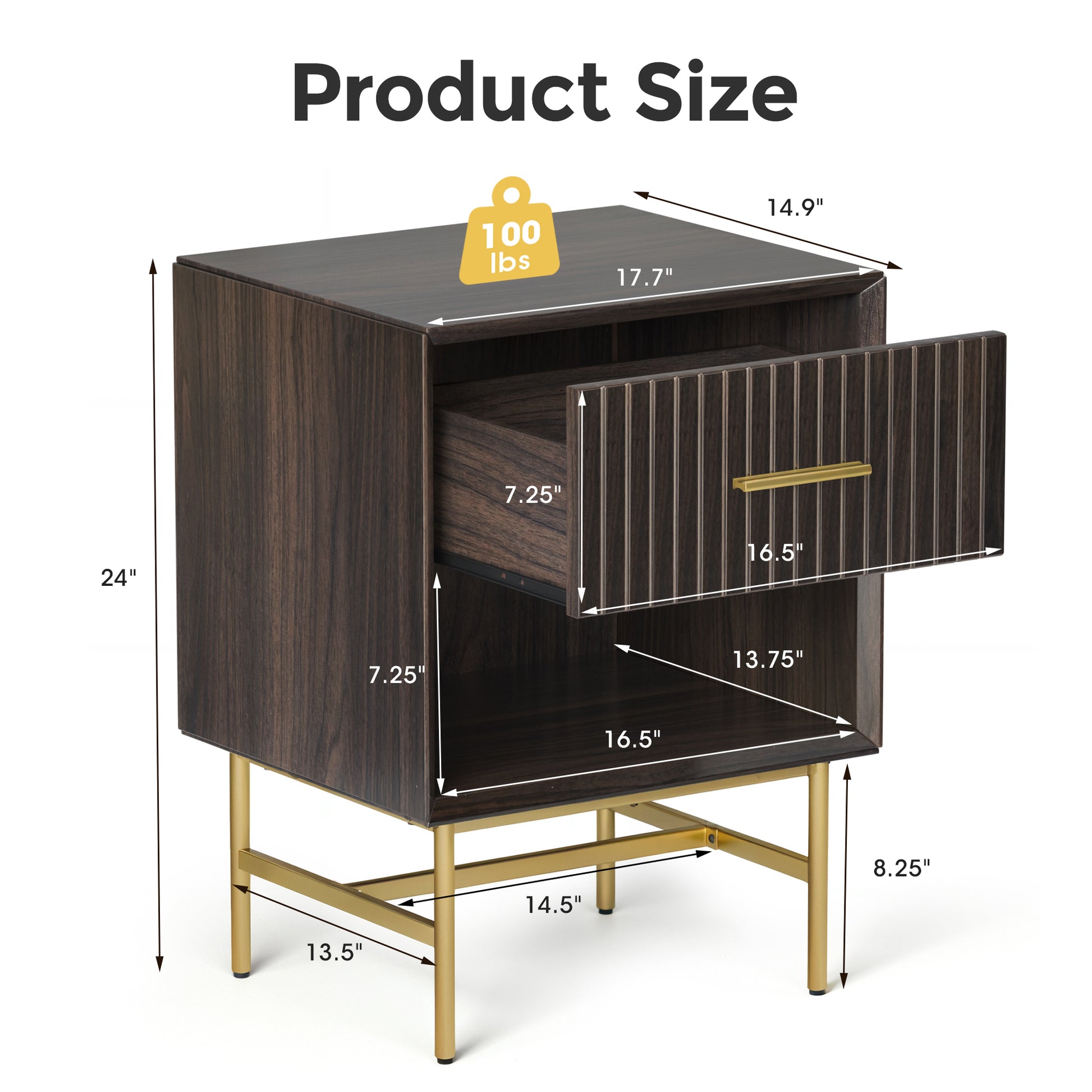 Nightstand, Modern Grooved Stripes Bed Side Table With A Drawer,Wood End Table With Golden Metal Handle And Metal Legs 1 Pieces Brown Wood Metal