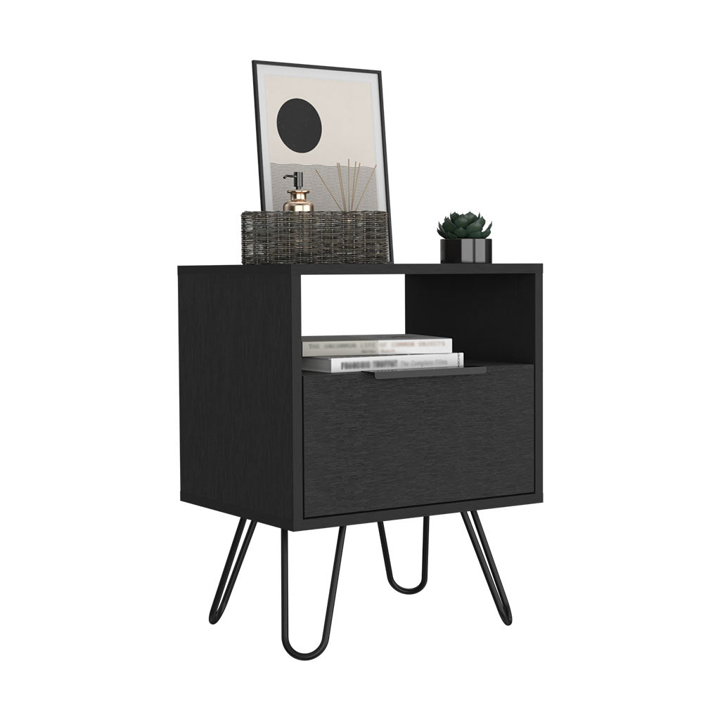 Nightstand Skyoner, Single Drawer, Hairpin Legs, Black Wengue Finish Black Particle Board
