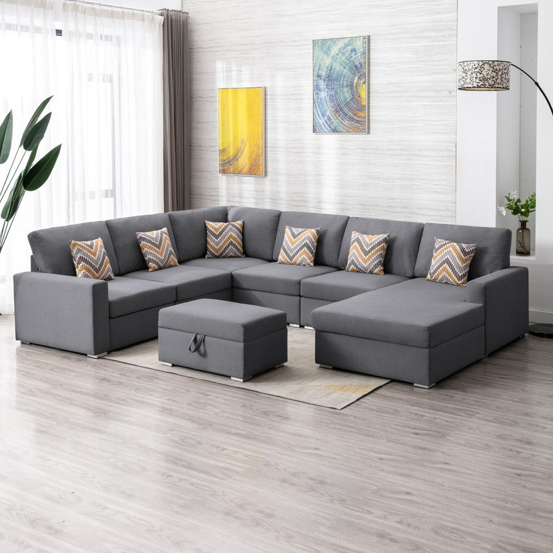 Nolan 124" Gray Linen Fabric 7Pc Reversible Chaise Sectional Sofa With Interchangeable Legs, Pillows And Storage Ottoman Gray Linen