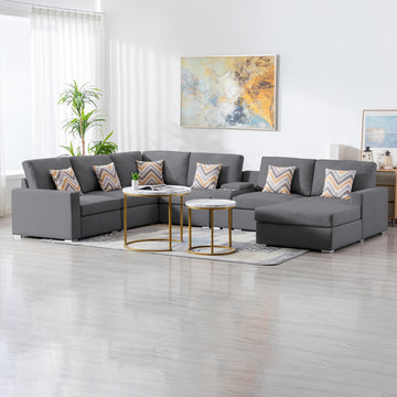 Nolan 135" Gray Linen Fabric 7Pc Reversible Chaise Sectional Sofa With A Usb, Charging Ports, Cupholders, Storage Console Table And Pillows And Interchangeable Legs Gray Linen