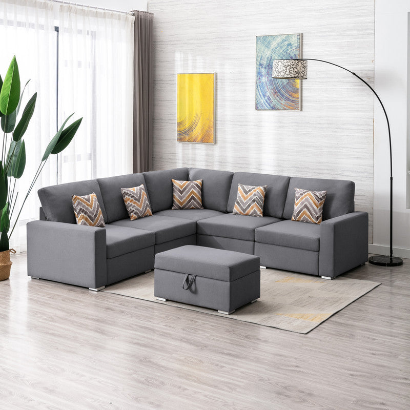 Nolan 95.5" Gray Linen Fabric 6Pc Reversible Sectional Sofa With Pillows, Storage Ottoman, And Interchangeable Legs Gray Linen