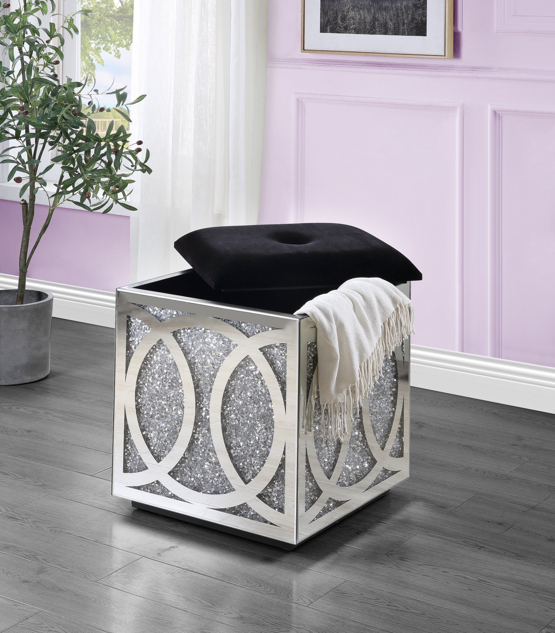 Noralie Ottoman W Storage Mirrored & Faux Diamonds Ac00529 Silver Glass