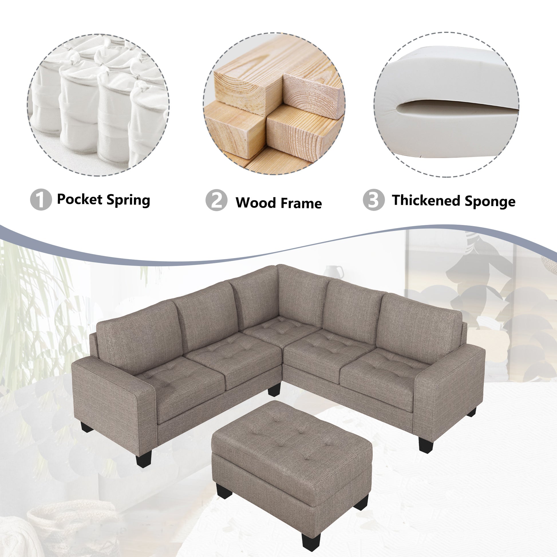 Orisfur. Sectional Corner Sofa L Shape Couch Space Saving With Storage Ottoman & Cup Holders Design For Large Space Dorm Apartment Brown Foam Linen