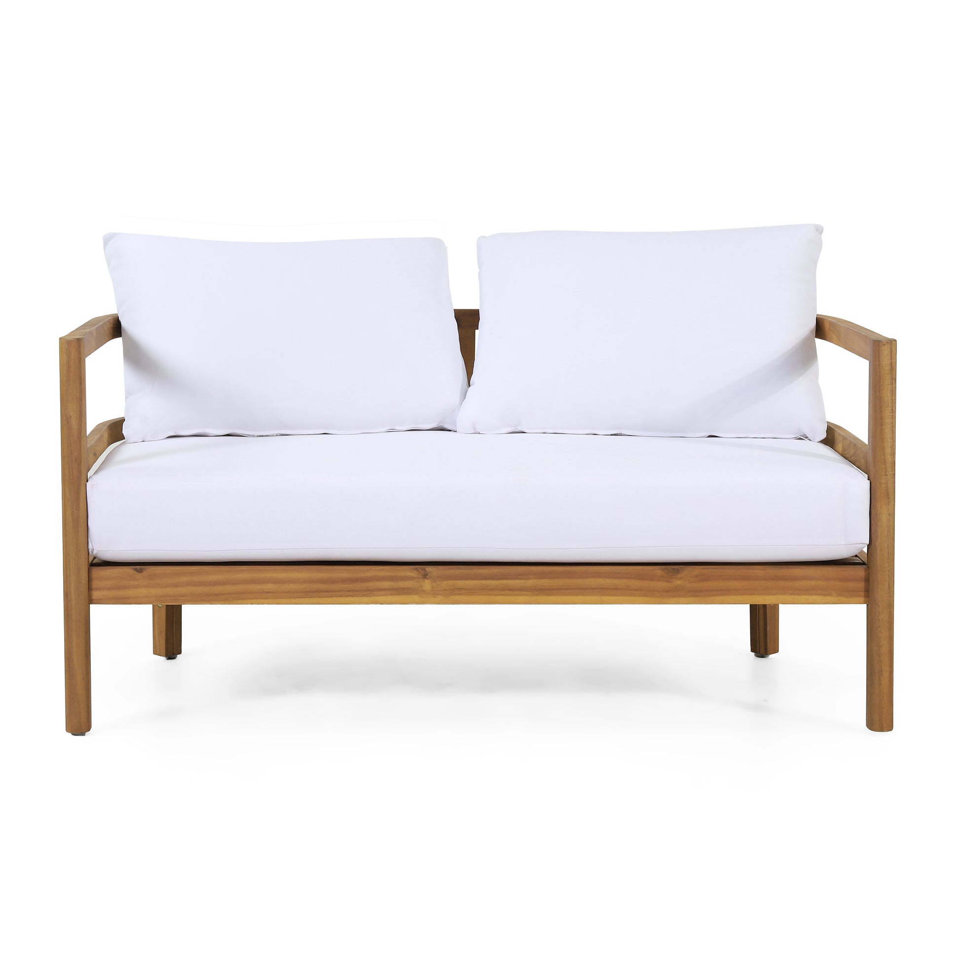 Outdoor Acacia Wood Loveseat And Coffee Table Set With Cushions, Teak And White Brown White Acacia Wood
