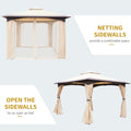 Outsunny 10' X 12' Outdoor Gazebo With Netting And Curtains, Patio Gazebo Canopy With 2 Tier Soft Top Roof And Steel Frame For Lawn, Garden, Backyard And Deck Beige Brown Steel