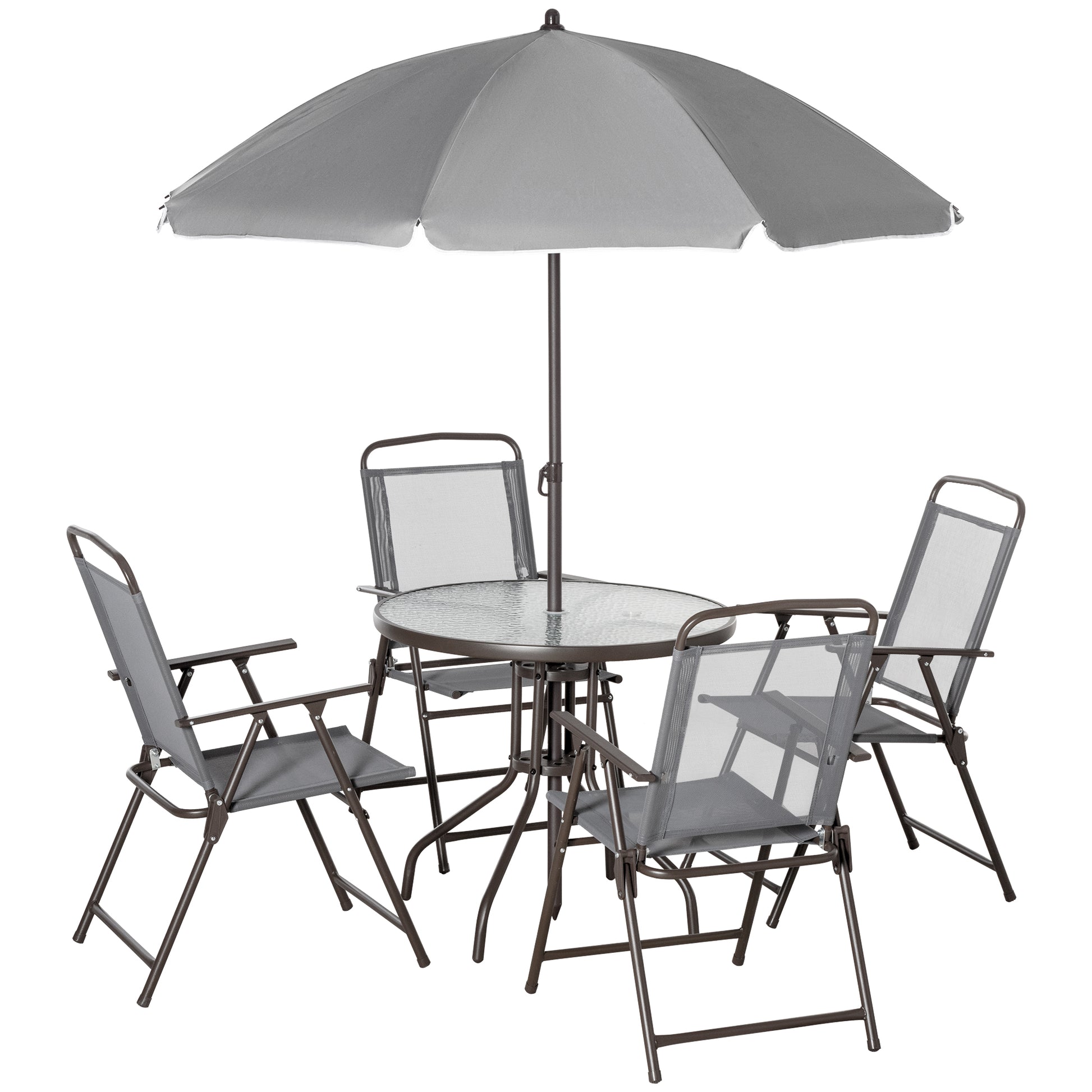 Outsunny 6 Piece Patio Dining Set For 4 With Umbrella, Outdoor Table And Chairs With 4 Folding Dining Chairs & Round Glass Table For Garden, Backyard And Poolside, Gray Gray Steel