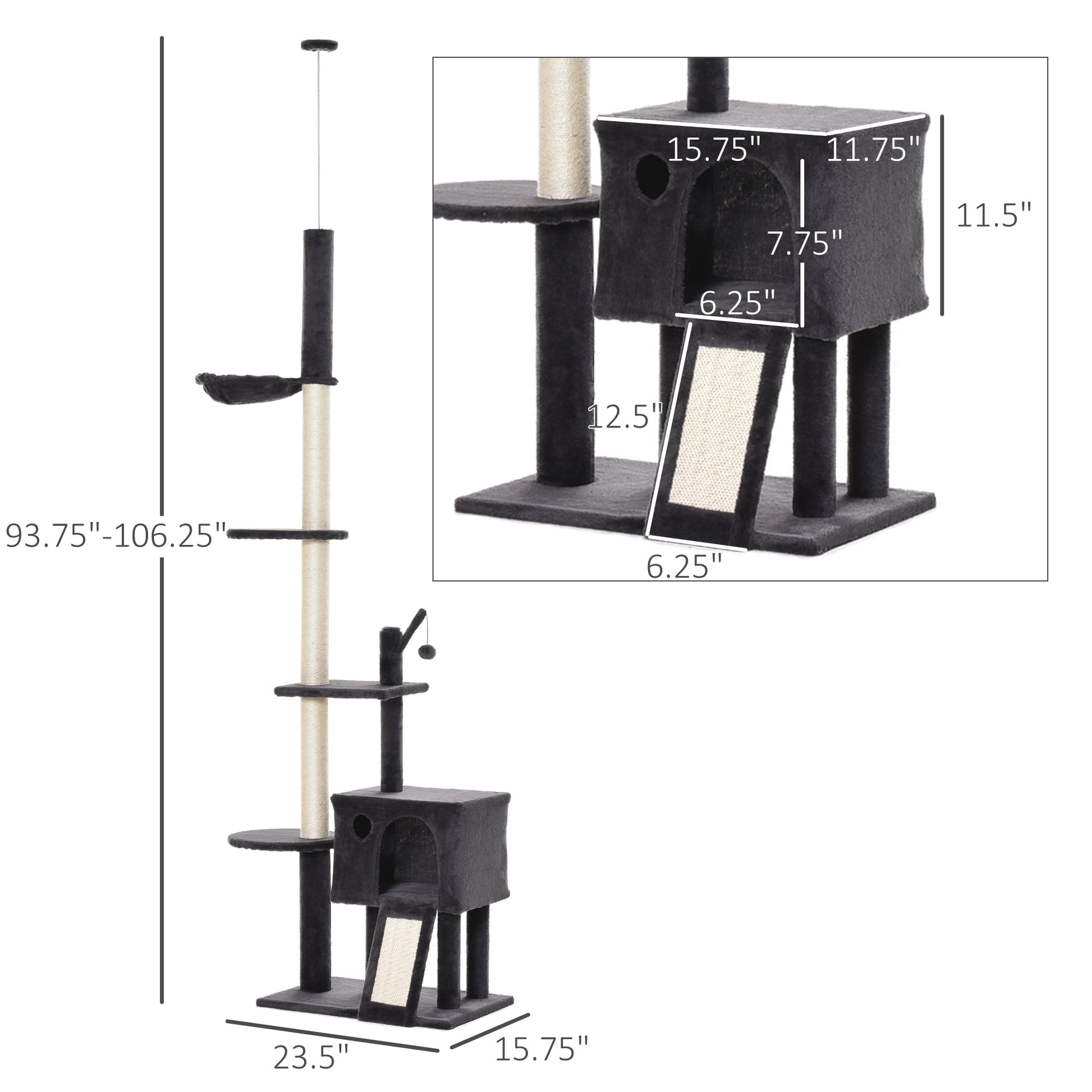 Pawhut 106" Huge Cat Tree Kitty Activity Center Floor To Ceiling Cat Climbing Toy With Scratching Post Board Hammock Hanging Ball Rest Pet Furniture Dark Grey Gray Particle Board