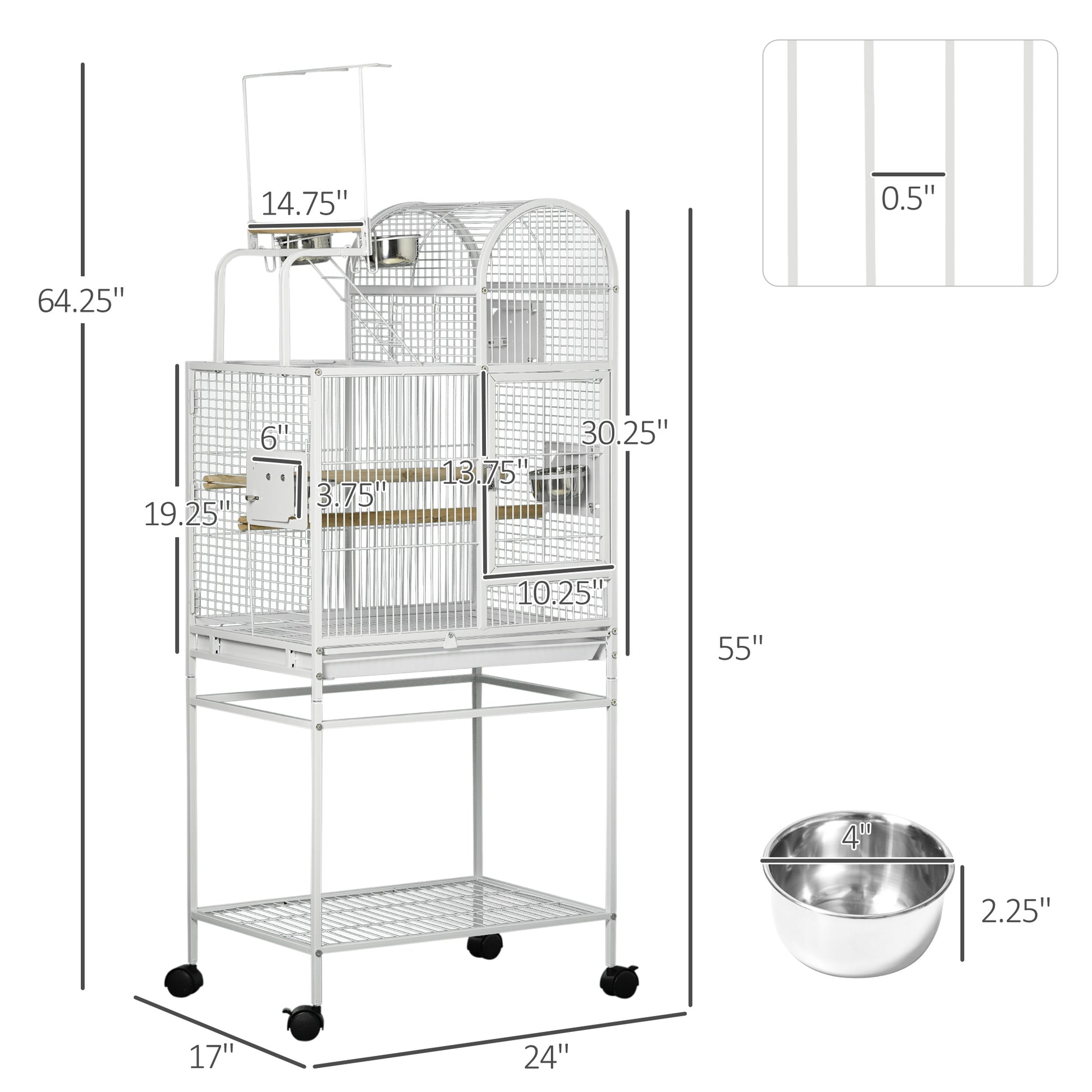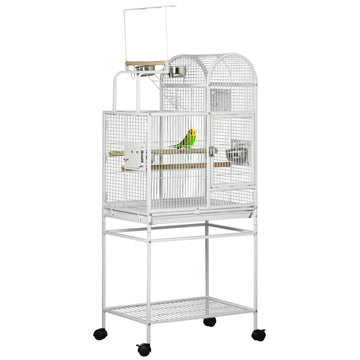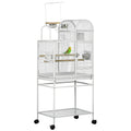 Pawhut 55" Large Parrot Cage With Toy Hooks Above Top Bird Perch, Tray, Food Cups, Rolling Stand, Bird Cage For Cockatiels, Parakeets, Lovebirds White Steel