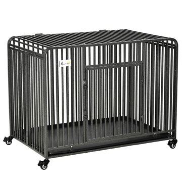 Pawhut Foldable Heavy Duty Dog Cage, Chew Proof Dog Crate On Wheels, Portable Dog Crate Kennel With Removable Tray, Large And Medium Pups, 43" Silver Steel