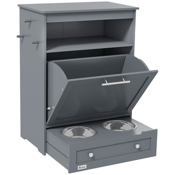 Pawhut Pet Feeder Station, Storage Cabinet Dog Food Storage Container With Raised Dog Bowls And Hanger For Feeding & Watering Supplies, Gray Gray Mdf
