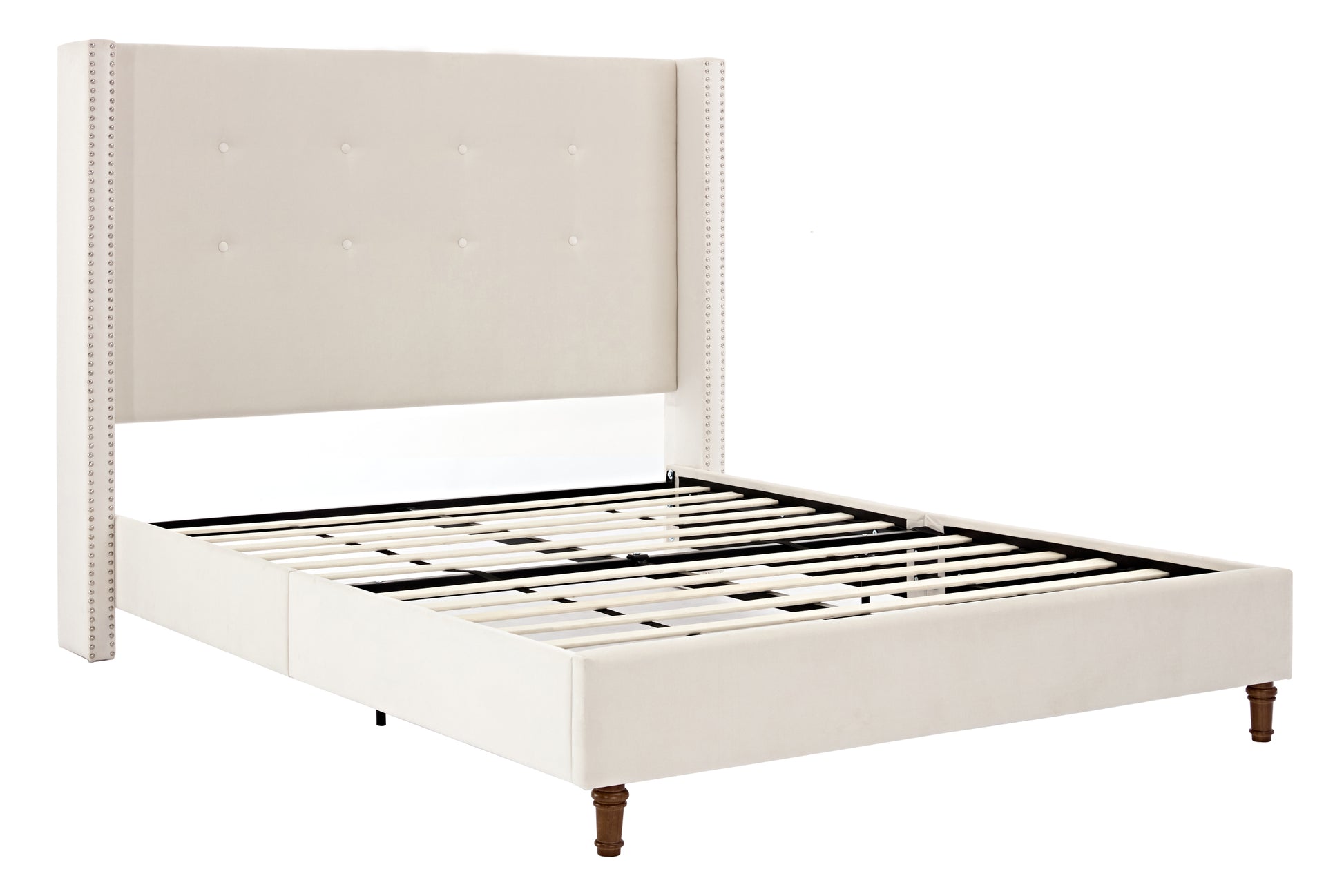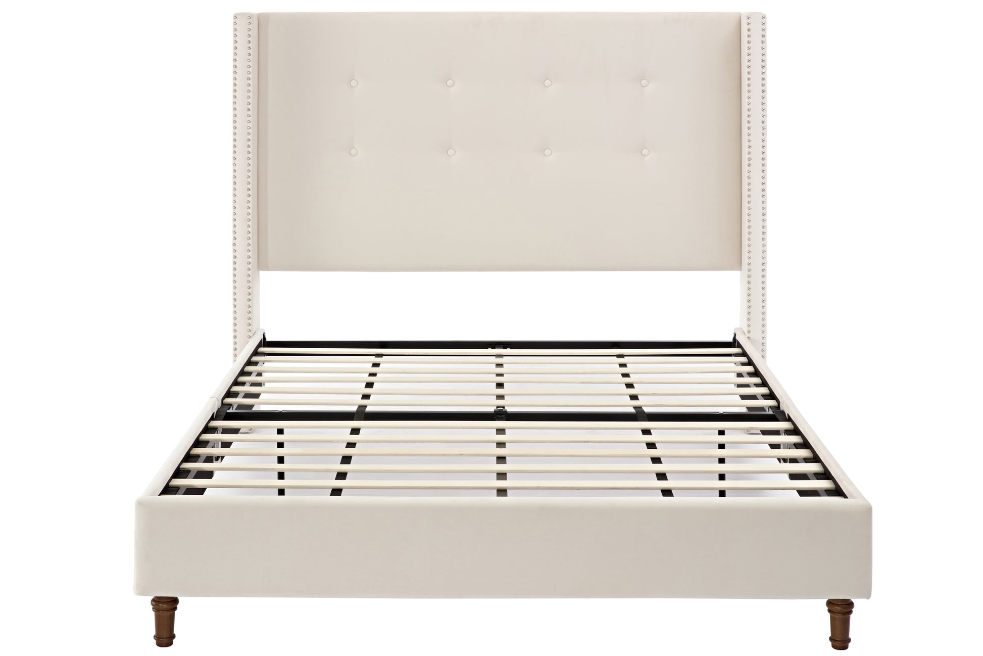 Peyton Upholstered Queen Bed 54" High Headboard Traditional Hand Buttoned Tufting Trim Wingback No Box Spring Needed Easy Assembly Ivory Velvet Box Spring Not Required Queen Ivory Brown Metal Bedroom Classic,European,Modern,Traditional Oak Bed Frame Foam