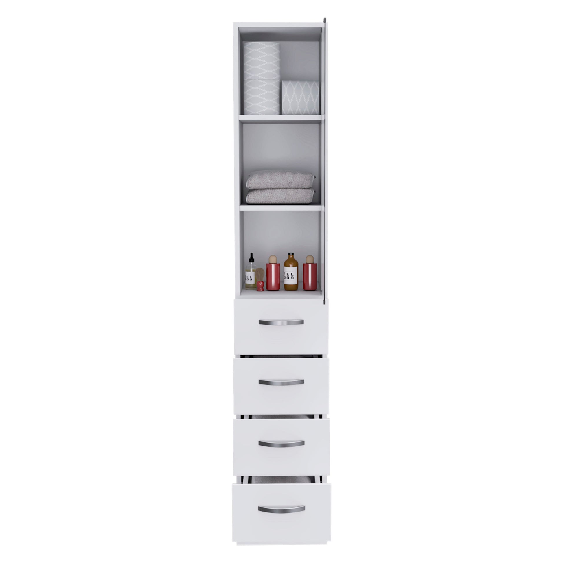 Preston Linen Cabinet, Three Shelves, Four Drawers 4 White 1 3 Up To 17 In 60 In & Above Conceled Hinges Bathroom Freestanding Modern 15 20 Inches Pine Engineered Wood