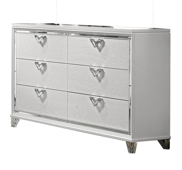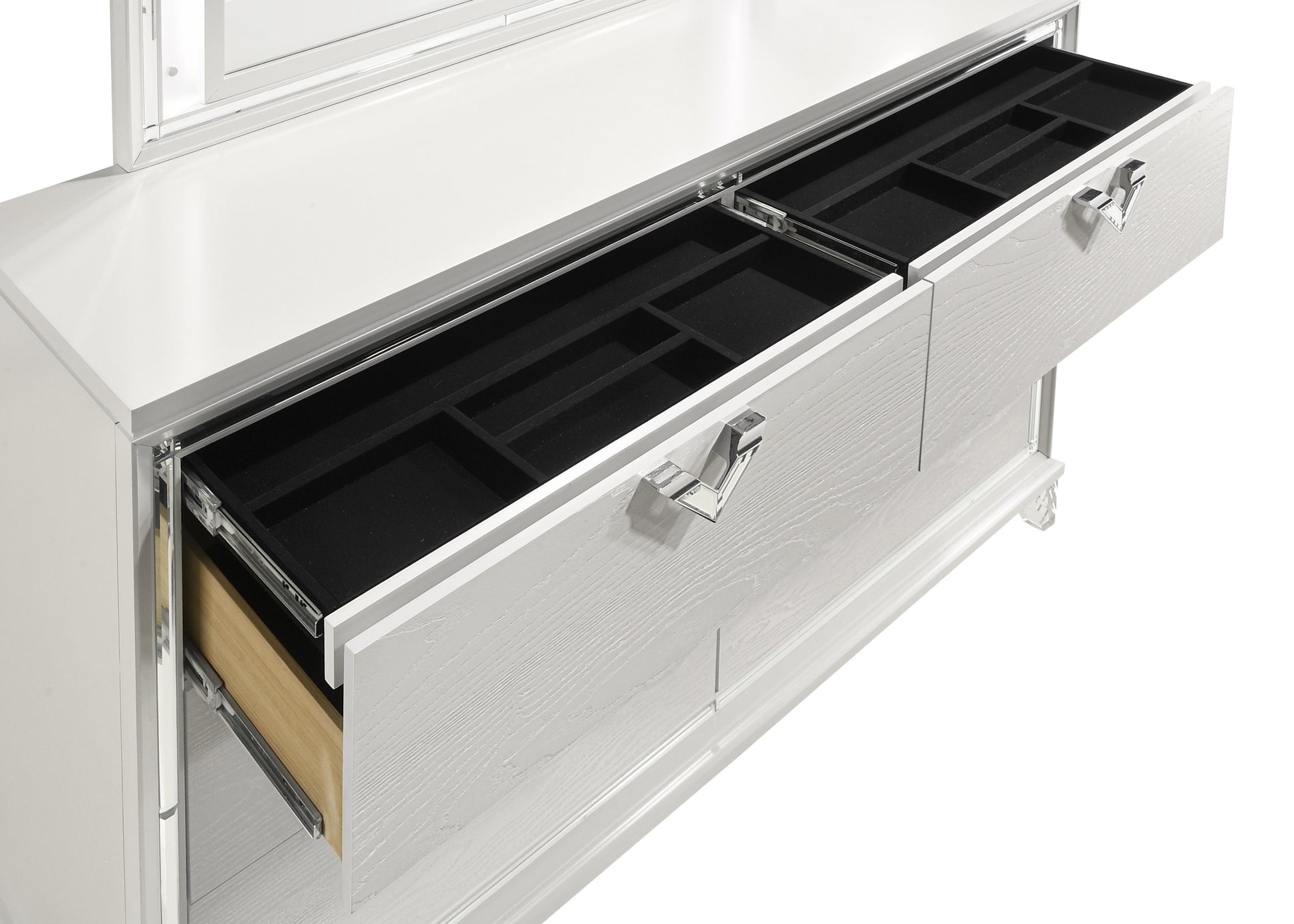Prism Modern Style 6 Drawer Dresser With Mirror Accent & V Shape Handles In White Silver Bedroom Modern Wood
