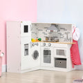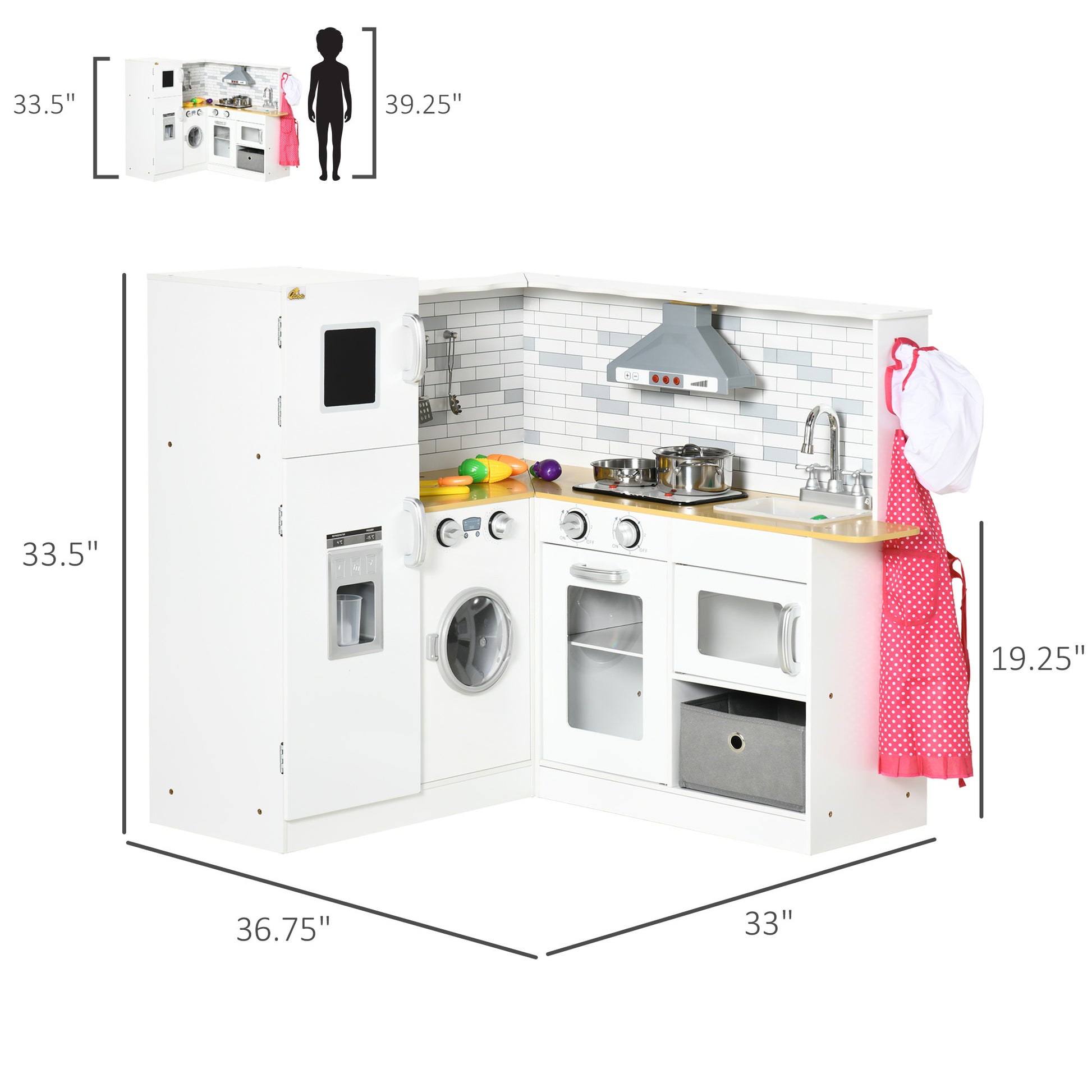 Qaba Corner Play Kitchen Set With Sound Effects And Tons Of Countertop Space, Large Wooden Kitchen With Washing Machine, Food Toys, Ice Maker, Kids Kitchen, Ages 3 6, White White Mdf