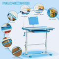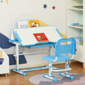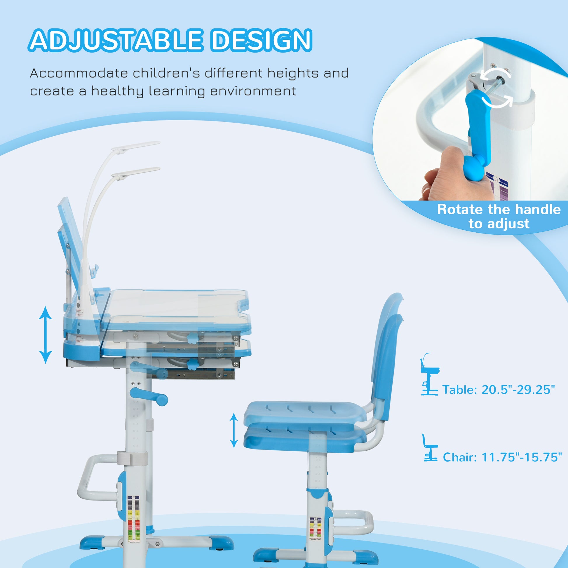 Qaba Kids Desk And Chair Set, Height Adjustable School Study Table And Chair, Student Writing Desk With Tilt Desktop, Led Light, Pen Box, Drawer, Reading Board, Cup Holder, And Pen Slots, Blue Blue Plastic
