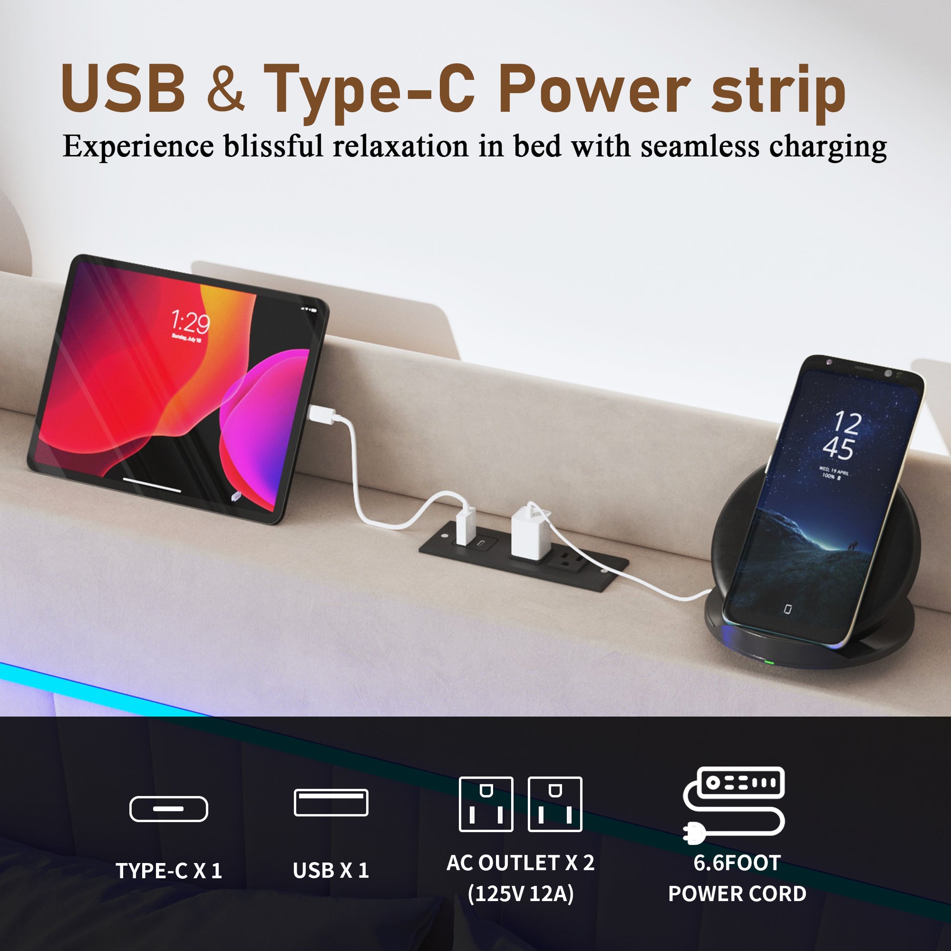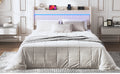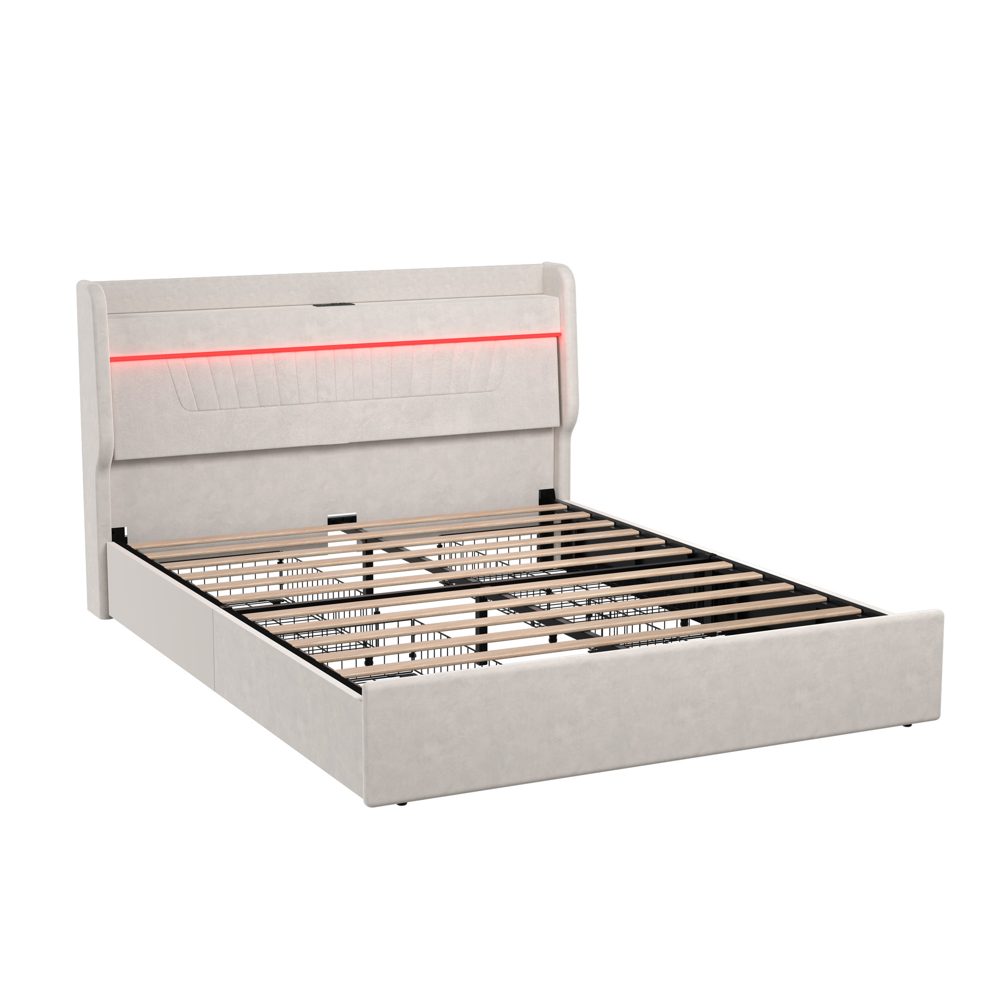 Queen Bed Frame With Storage Upholstered Headboard And 4 Drawers, Velvet Upholstered Platform Bed With Led Lights & Charging Station, Stable & Easy Assembly, No Box Spring Needed, Beige Box Spring