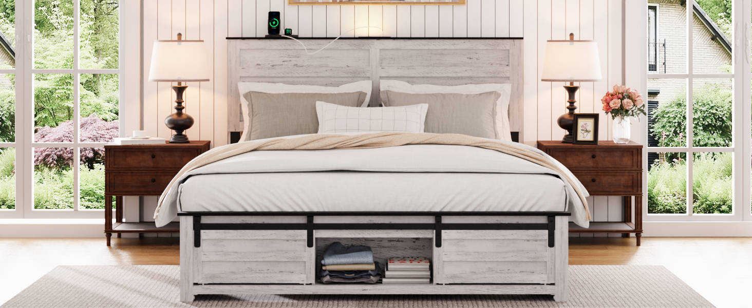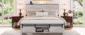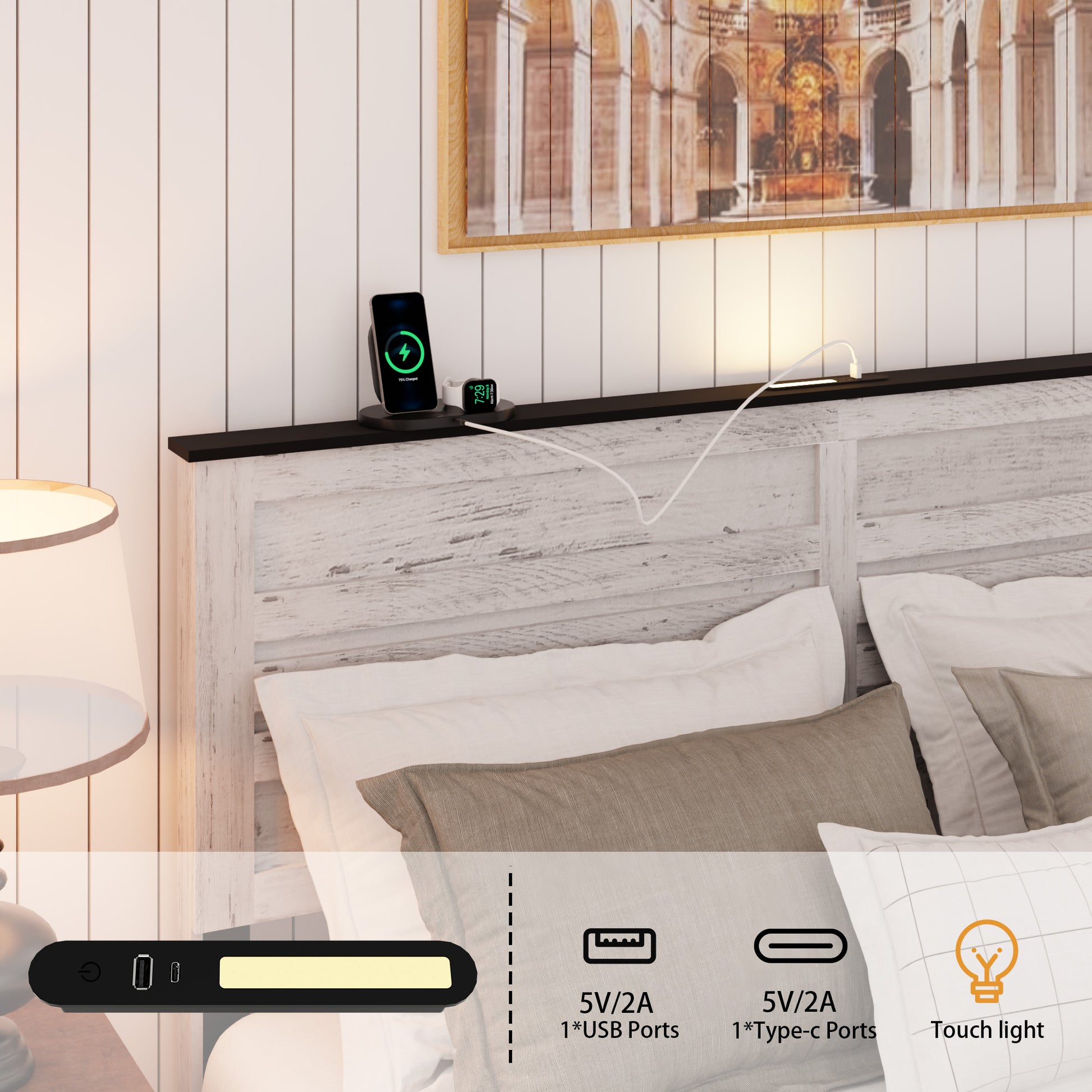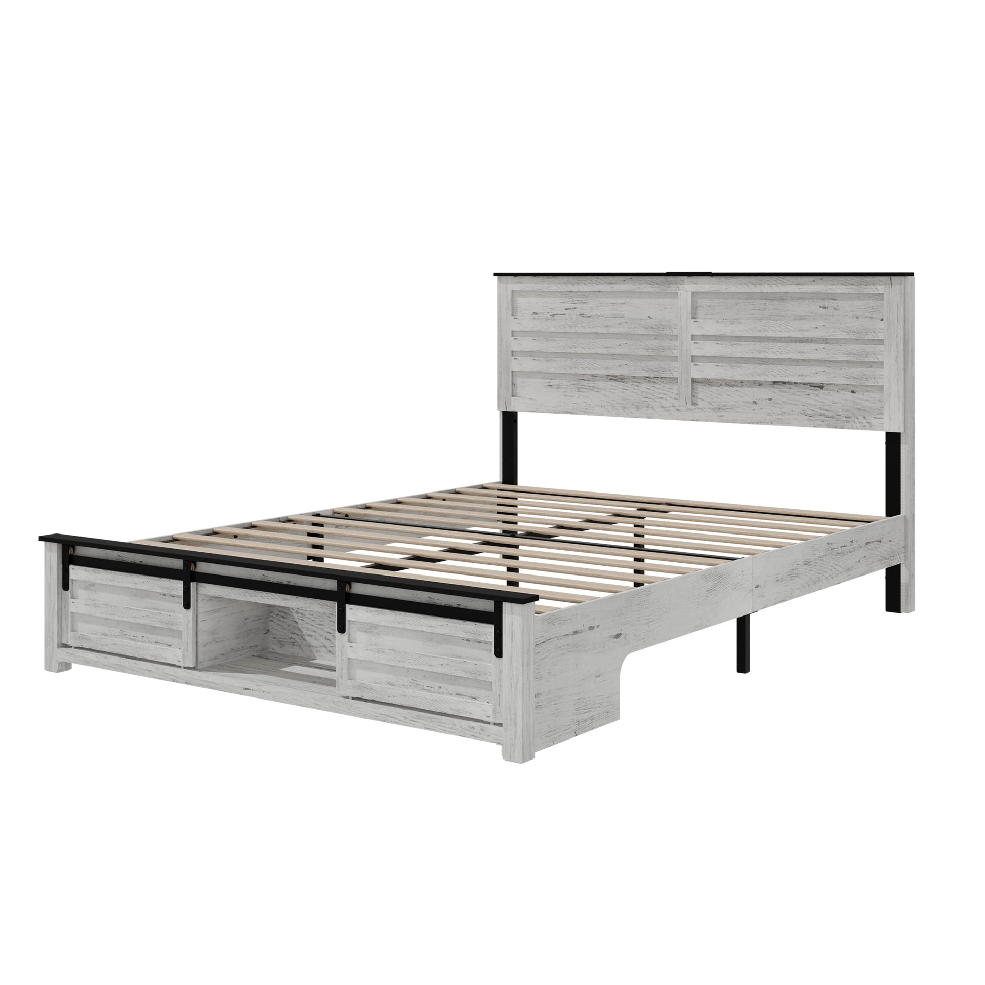 Queen Bed Frame With Upholstered Headboard And Wood Platform,Storage Headboard With Charging Station And Led, Bed Frame With Pet Bed,No Noise, No Box Spring Needed,Easy Assembly,Antique White Box