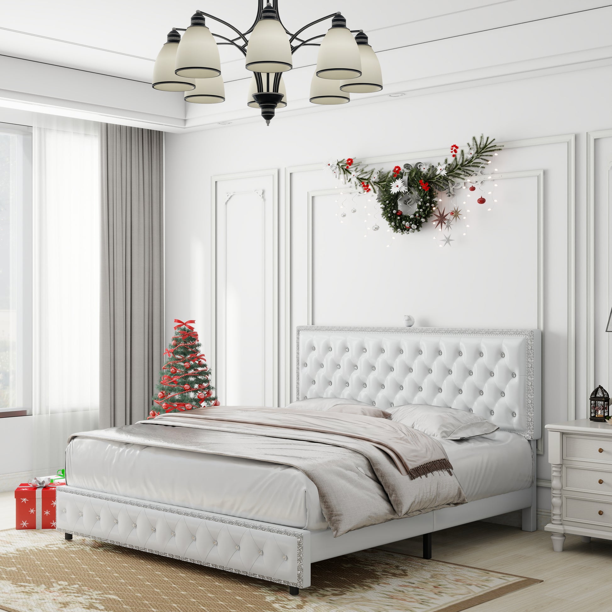 Queen Size Bed Frame With Star Projector Galaxy Light, Adjustable Upholstered Headboard With Diamond Button, Usb Charger, Music Speaker, Pu Leather White Pu Mdf Metal