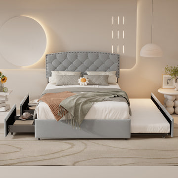 Queen Size Storage Platform Bed With 2 Big Drawers, Plush Velvet Bed With Trundle, Easy Assembly, For Bedroom, Apartment, Guest Room, Light Grey Box Spring Not Required Queen Light Grey Wood Bedroom Bed Frame Velvet Velvet
