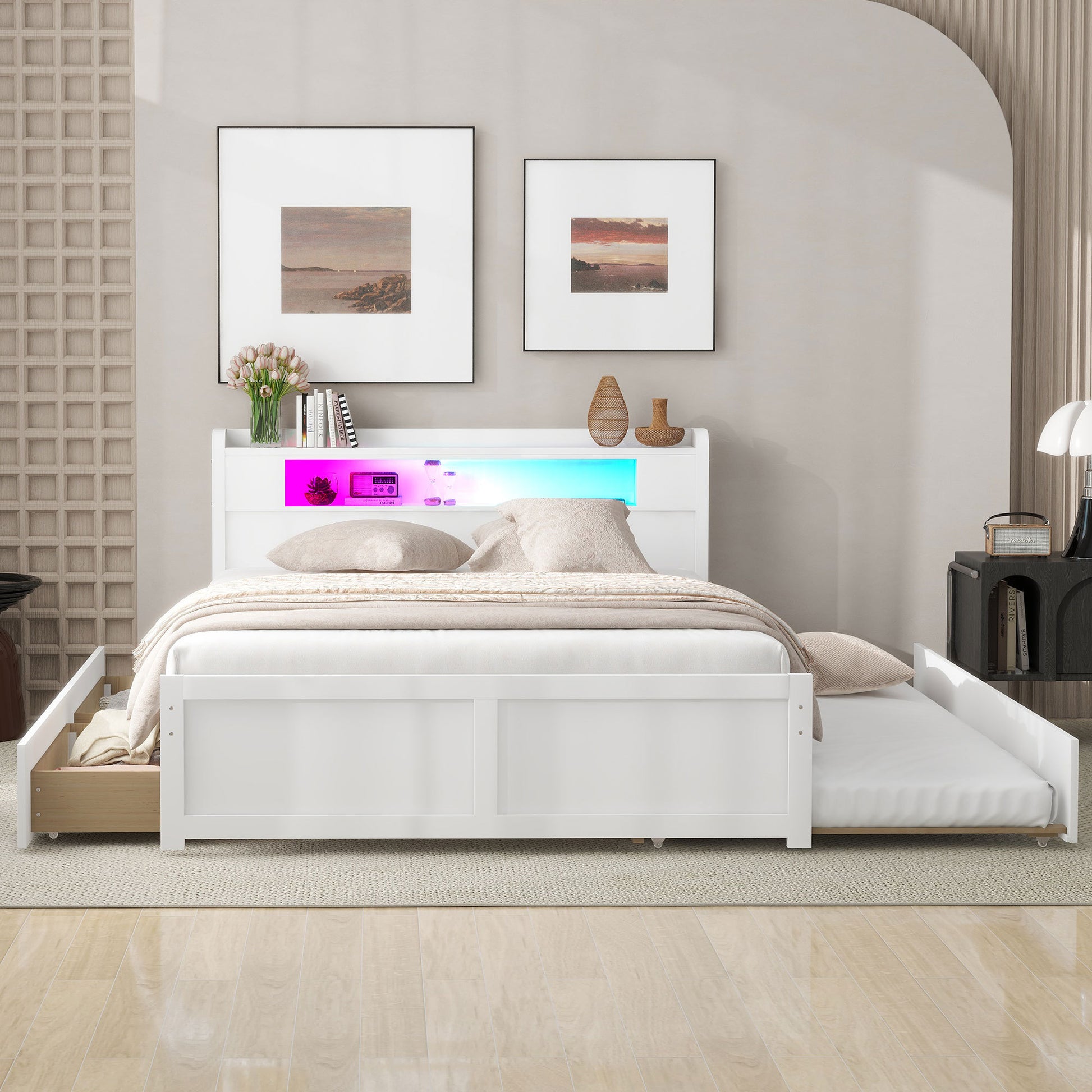 Queen Size Wood Storage Platform Bed With Led, 2 Drawers And 1 Twin Size Trundle, White Box Spring Not Required Queen White Wood Bedroom Bed Frame Solid Wood Mdf