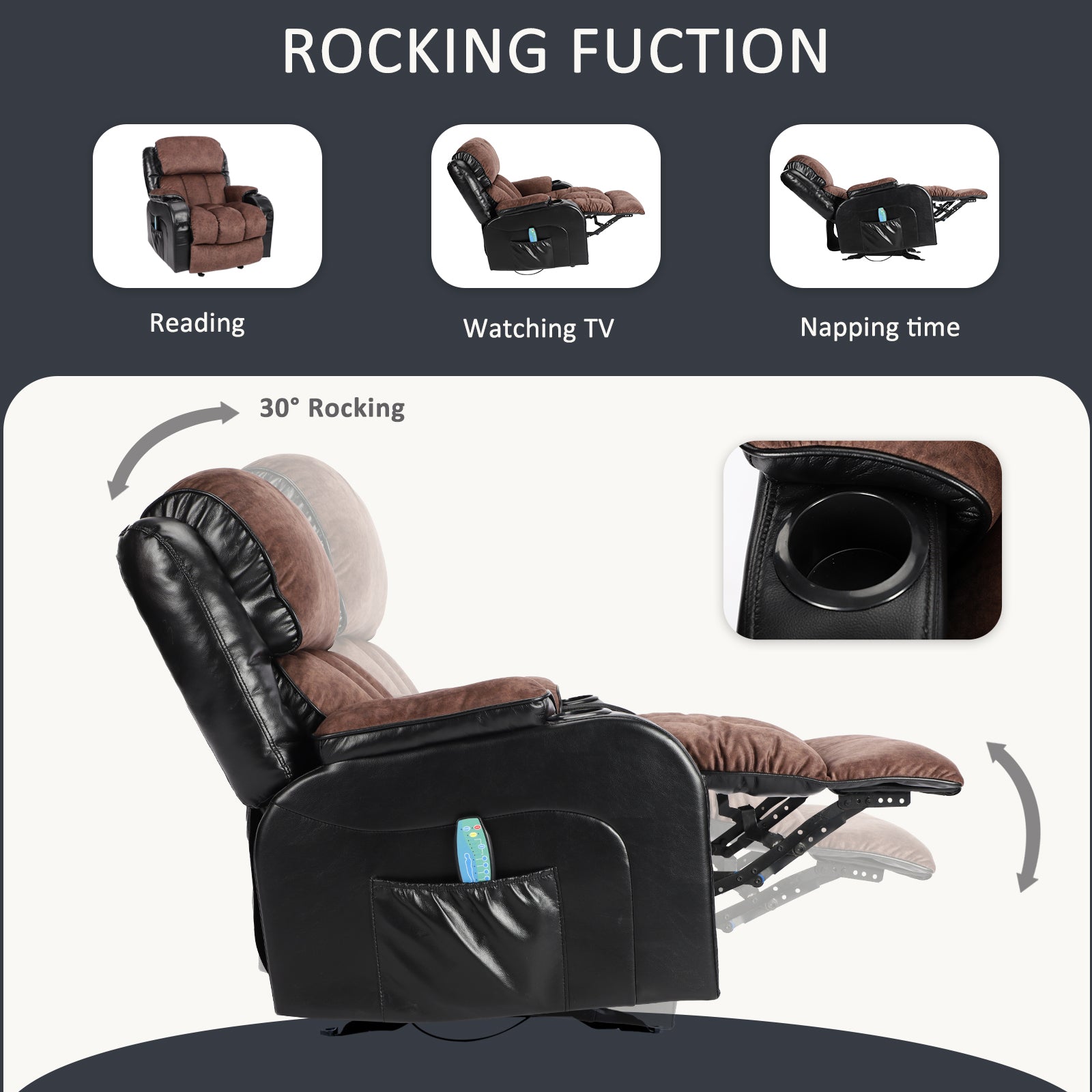 Recliner Chair For Living Room With Rocking Function And Side Pocket Blackbrown Black Brown Soft Foam Polyester