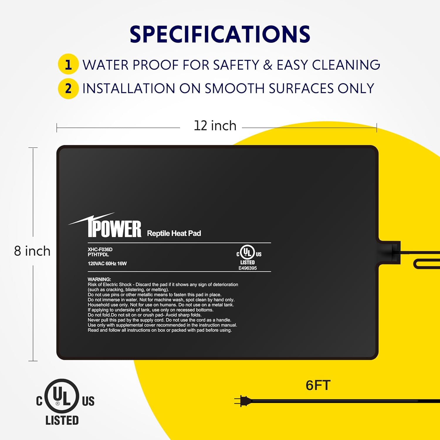 Reptile Heat Pad 8X12 Inch 16W Under Tank Terrarium Warmer Heating Mat For Turtle, Lizard, Frog, Snake, Reptile, And Other Small Animals Black Pvc