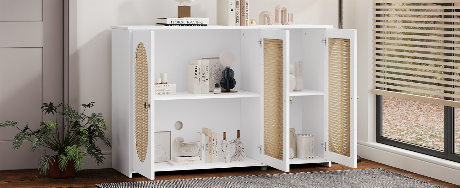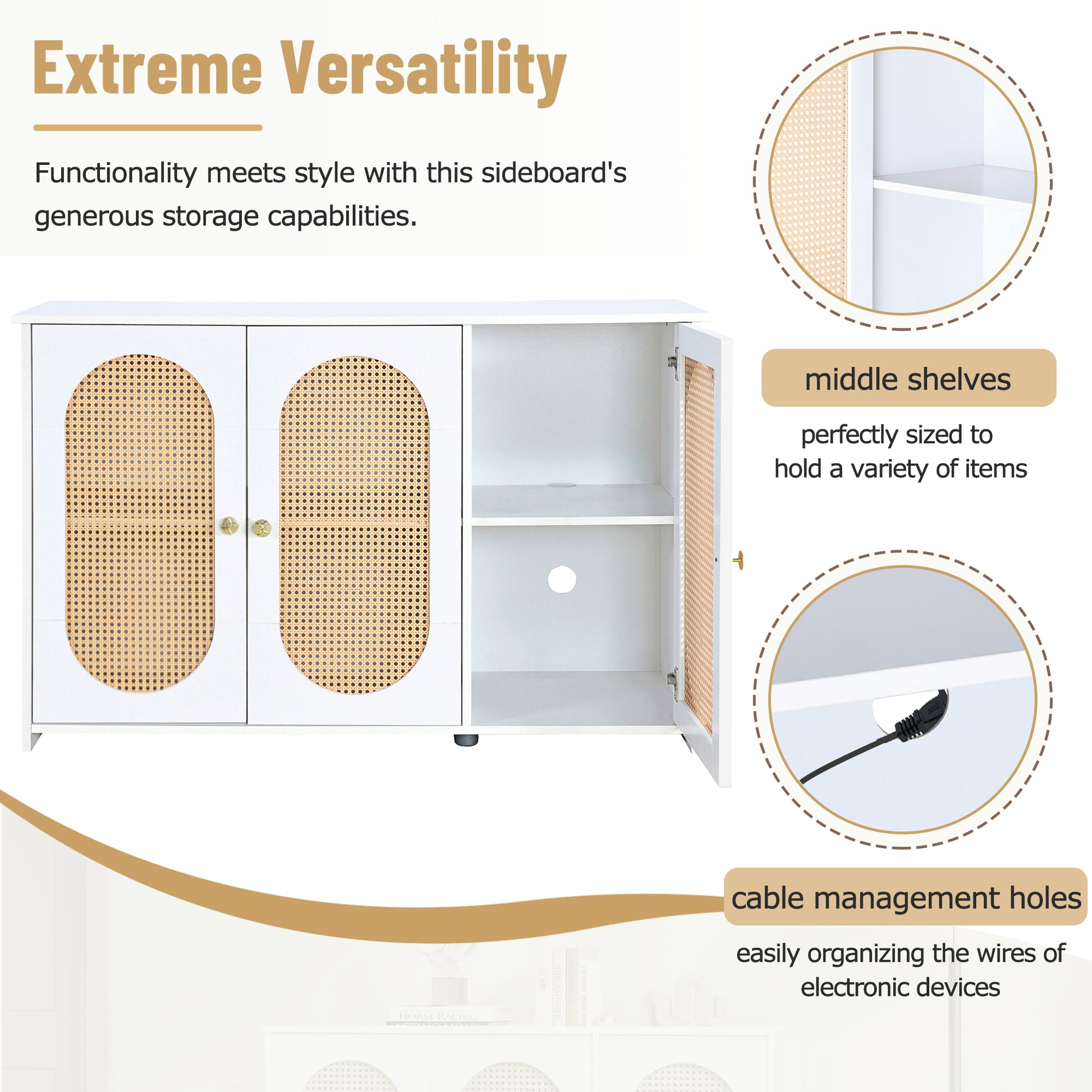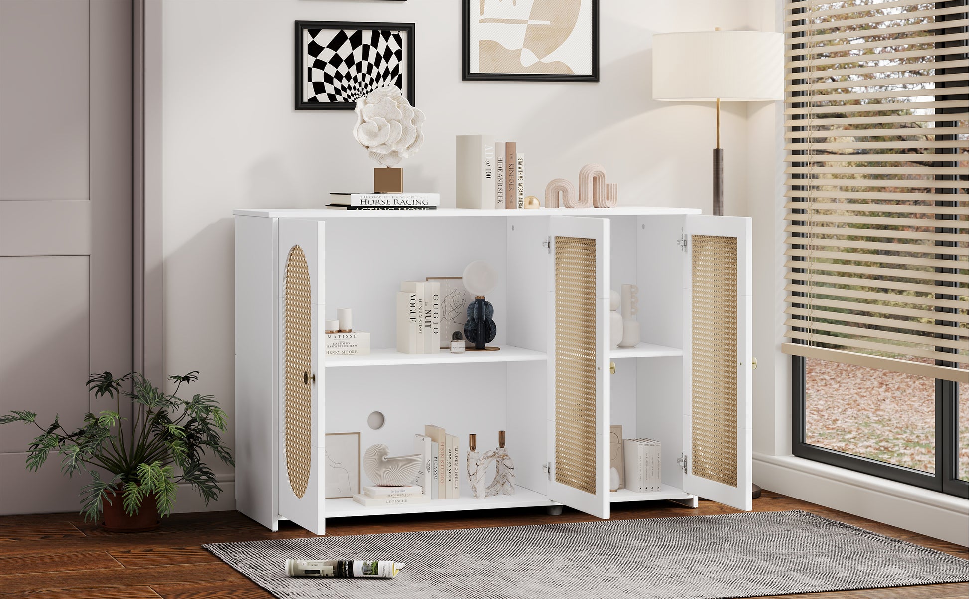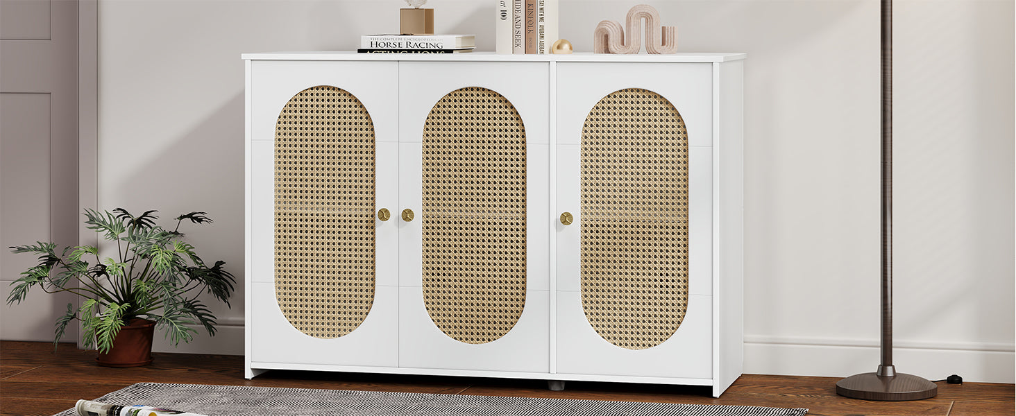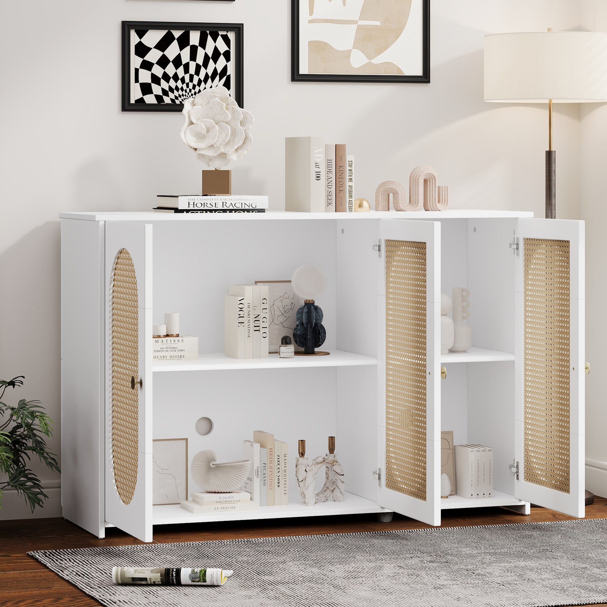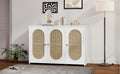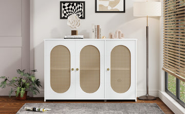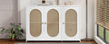 Retro 3 Door Sideboard With Large Storage Space Artificial Rattan Doors And Metal Handles, Accent Cabinet For Living Room And Hallway White White Particle Board Mdf