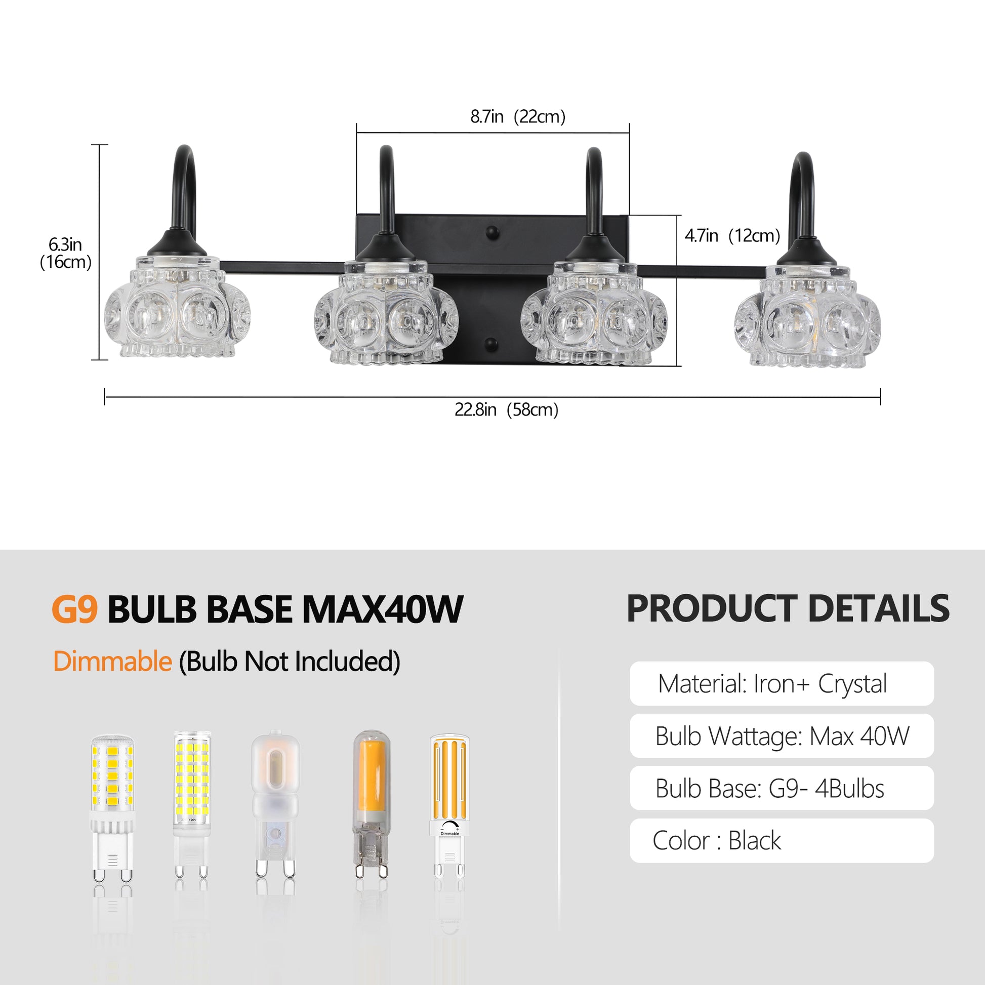 Retro 4 Light Bathroom Vanity Light Fixture Black Finish With Crystal Glass Shades, Wall Mounted Lighting For Bathroom, Powder Room, And Vanity Mirror No Bulbs Black Crystal Iron