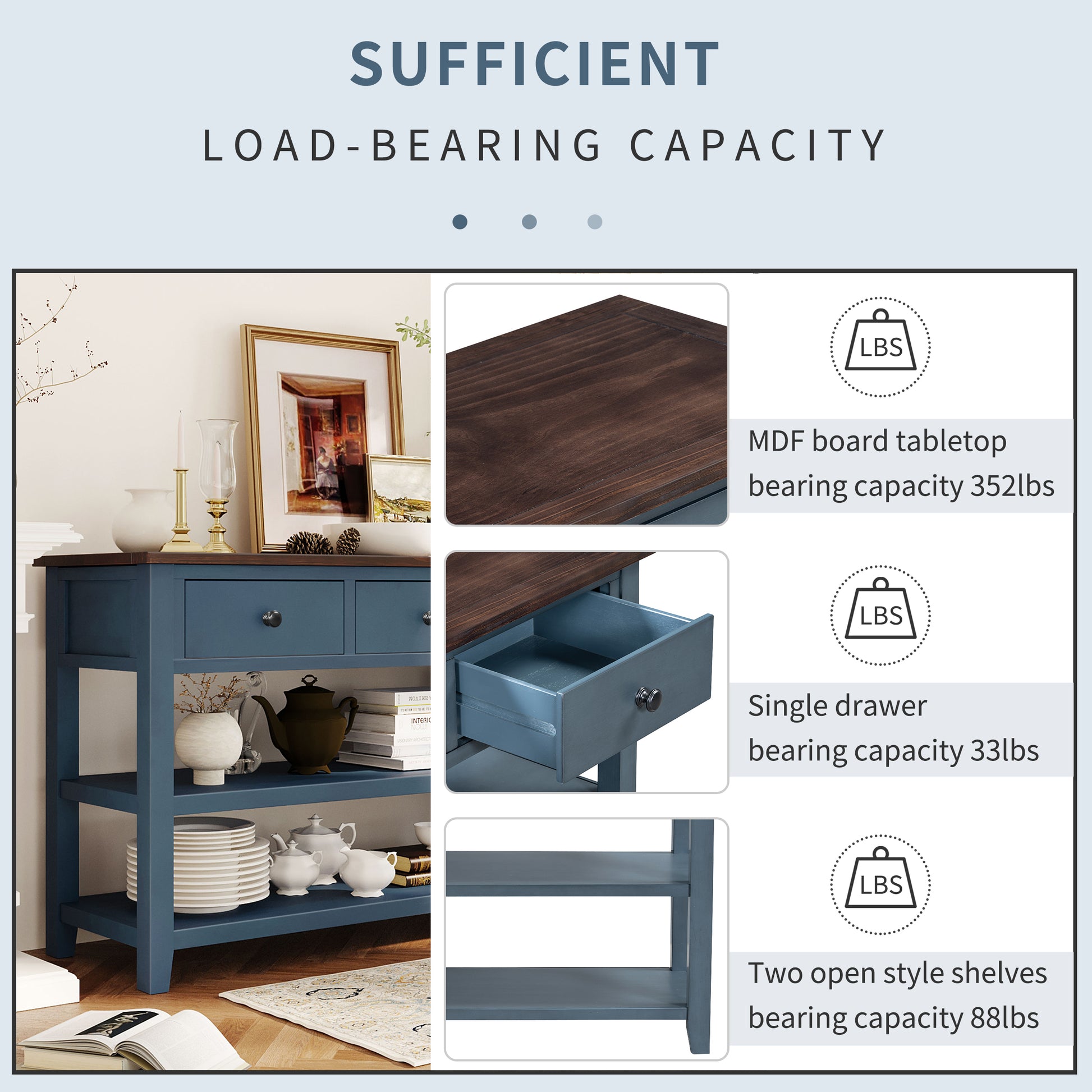 | Weight Capacity | Tabletop: 352 LBSShelves: 88 LBSDrawer: 33 LBS |