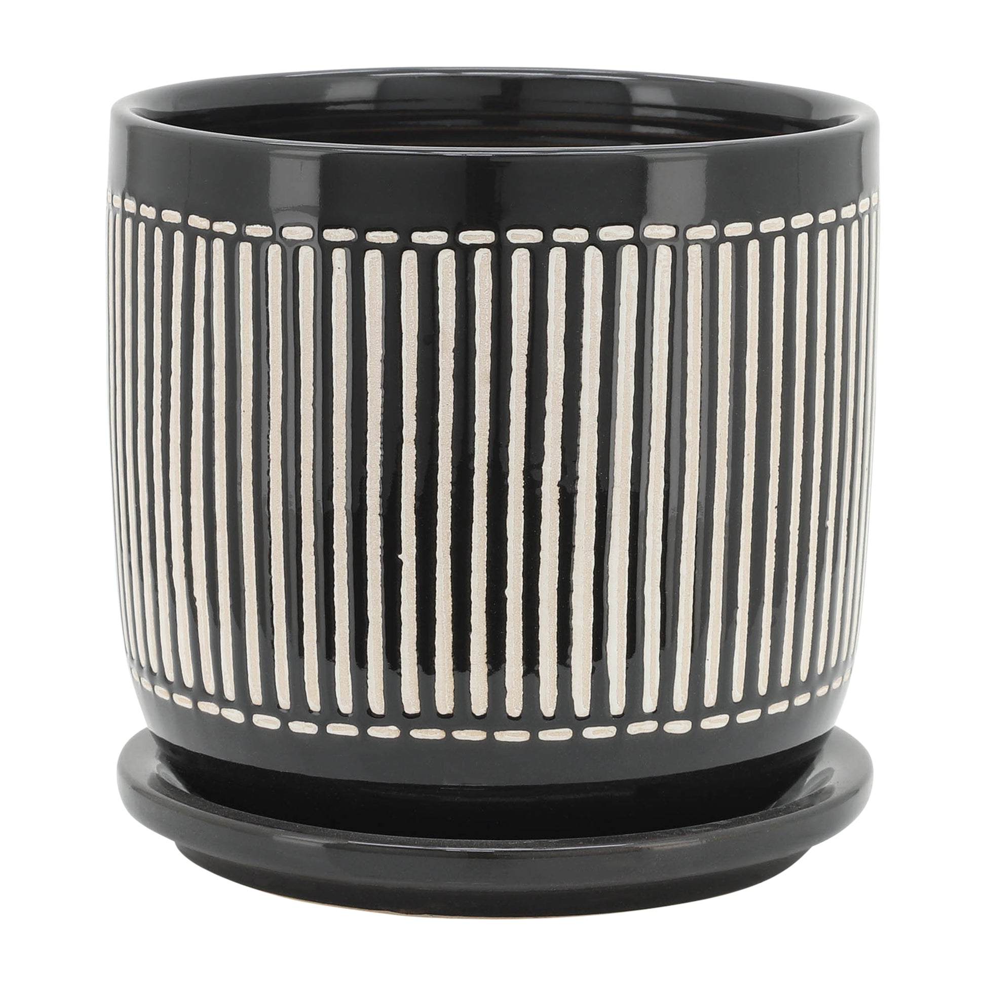 S 2 5 6" Vertical Lines Planter W Saucer, Black Black Ceramic