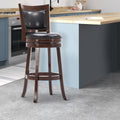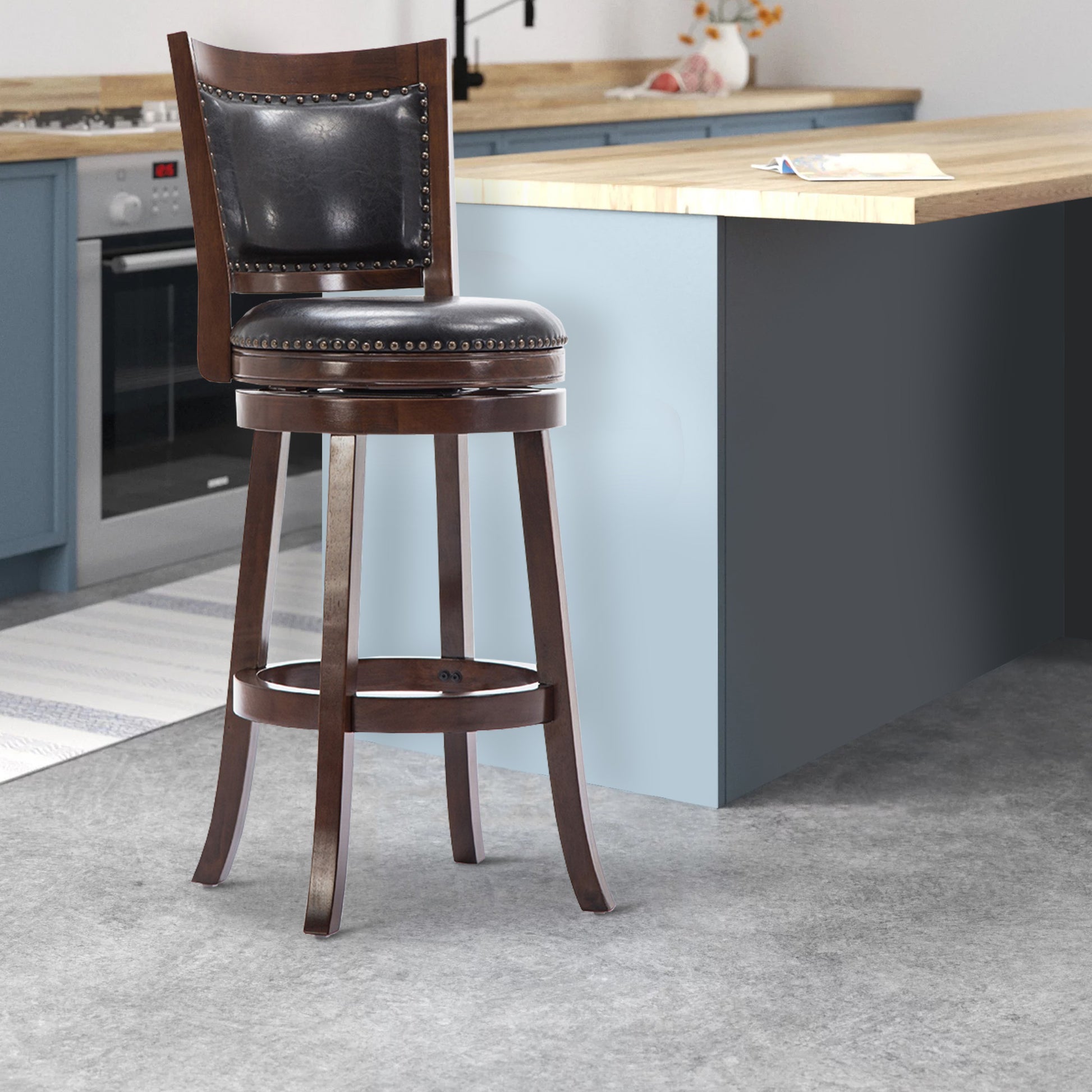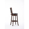 Sabi 29 Inch Swivel Counter Stool, Solid Wood, Faux Leather, Brown, Black Brown Black Wood Fabric