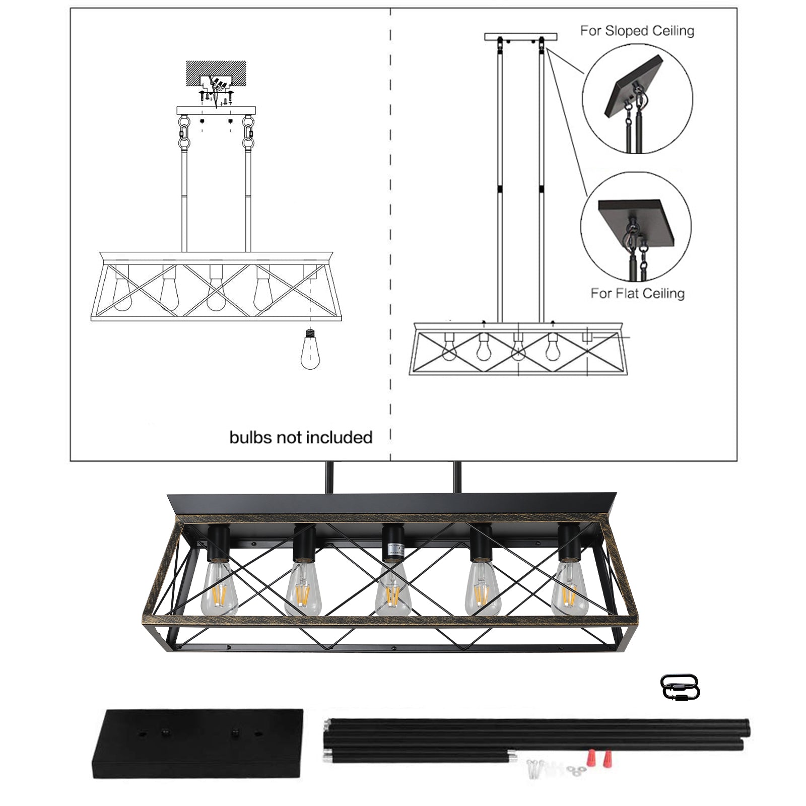 Same As W1340111201 L1007 5 Light Farmhouse Chandeliers For Dining Room, Metal Rustic Pendant Island Light Fixture, Modern Rectangular Island Lights For Kitchen, Living Room Black Gold No Bulbs