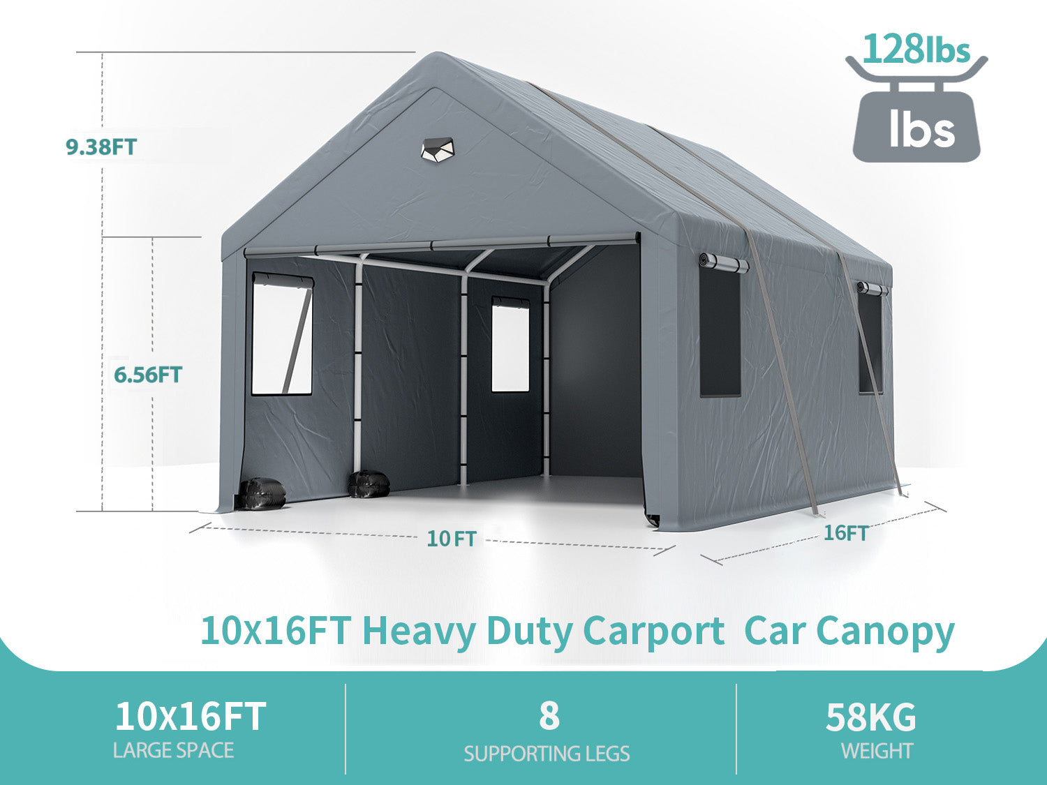 Sannwsg 10X16 Heavy Duty Carport Canopy Extra Large Portable Car Tent Garage With Roll Up Windows And All Season Tarp Cover,Side Walls & Removable Roof For Car, Suv,Boats&Truck Shelter Logic Storage Gray None Garden & Outdoor High Wind Resistant Carports