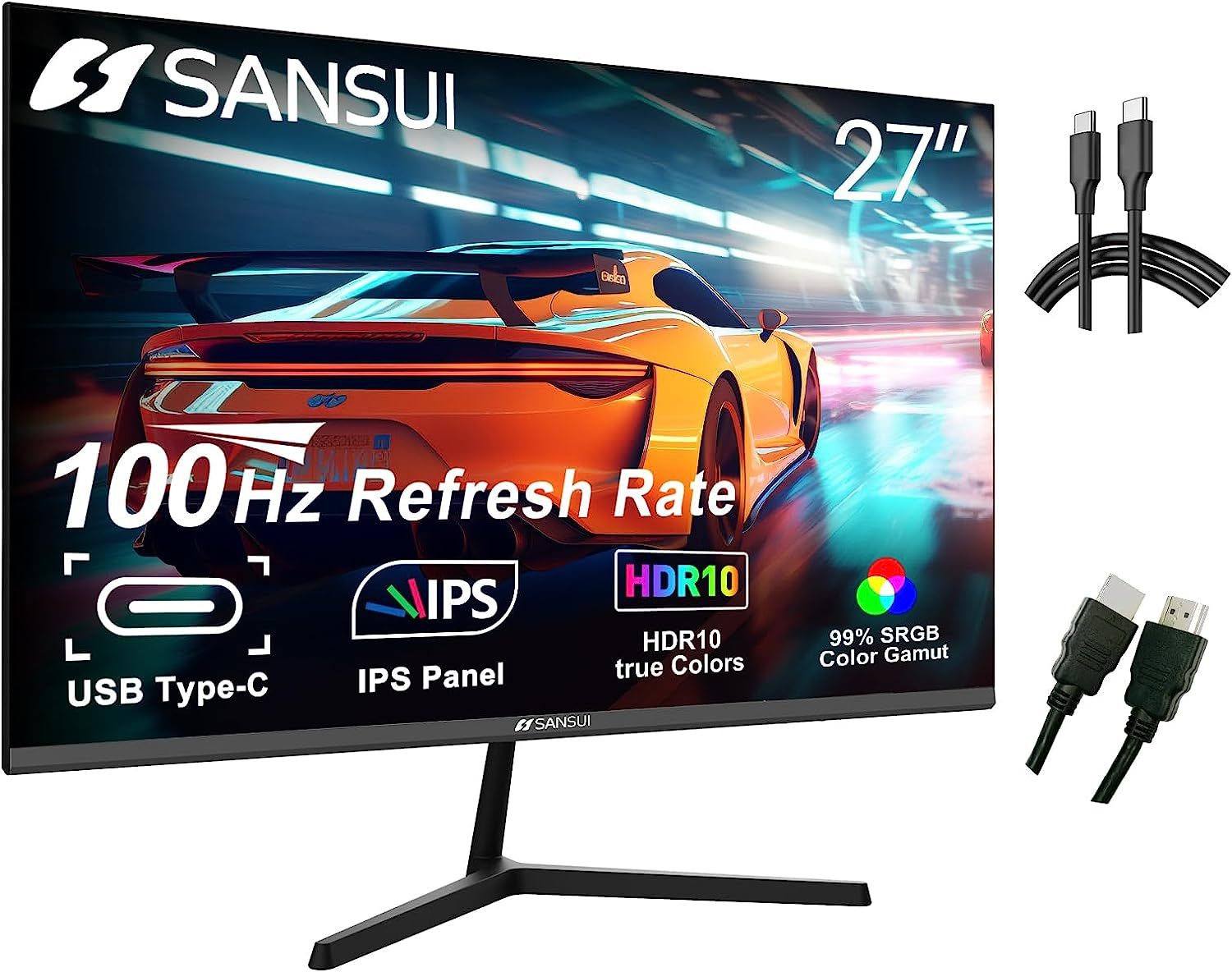 Sansui Computer Monitors 27 Inch 100Hz Ips Usb Type C Fhd 1080P Hdr10 Built In Speakers Hdmi Dp Game Rts Fps Tilt Adjustable For Working And Gaming Es 27X3 Type C Cable & Hdmi Cable Included Black Pvc
